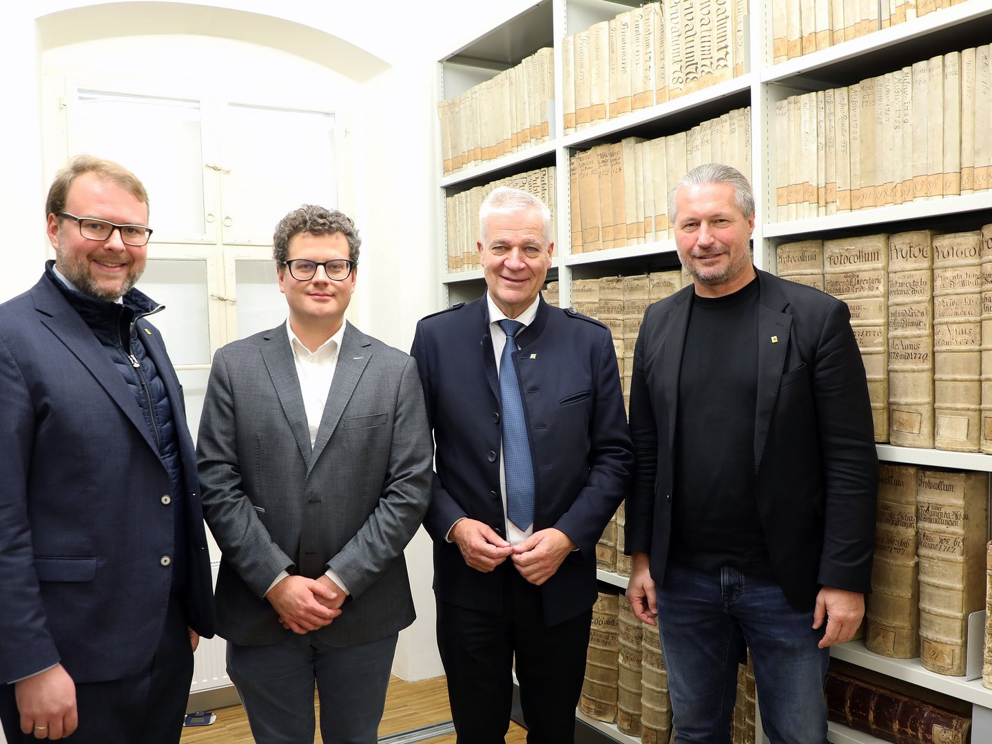 Vor wenigen Tagen besuchte der neue Landesrat Anton Kasser das Stadtarchiv Krems. Der Nachfolger von Ludwig Schleritzko ist neben Finanzen und Krankenanstalten auch für das Archivwesen in Niederösterreich zuständig. In den Räumlichkeiten des Stadtarchivs stellte er sich als zuständiger politischer Referent des Landes vor und verschaffte sich einen Überblick über die Arbeit im Stadtarchiv. Gemeinsam mit Bürgermeister Peter Molnar und Vizebürgermeister Florian Kamleitner besichtigte Anton Kasser das Depot, ließ sich von Stadtarchivar Daniel Haberler-Maier ausgewählte Archivalien zeigen und informierte sich auch über die Zukunft der Archive im digitalen Zeitalter.