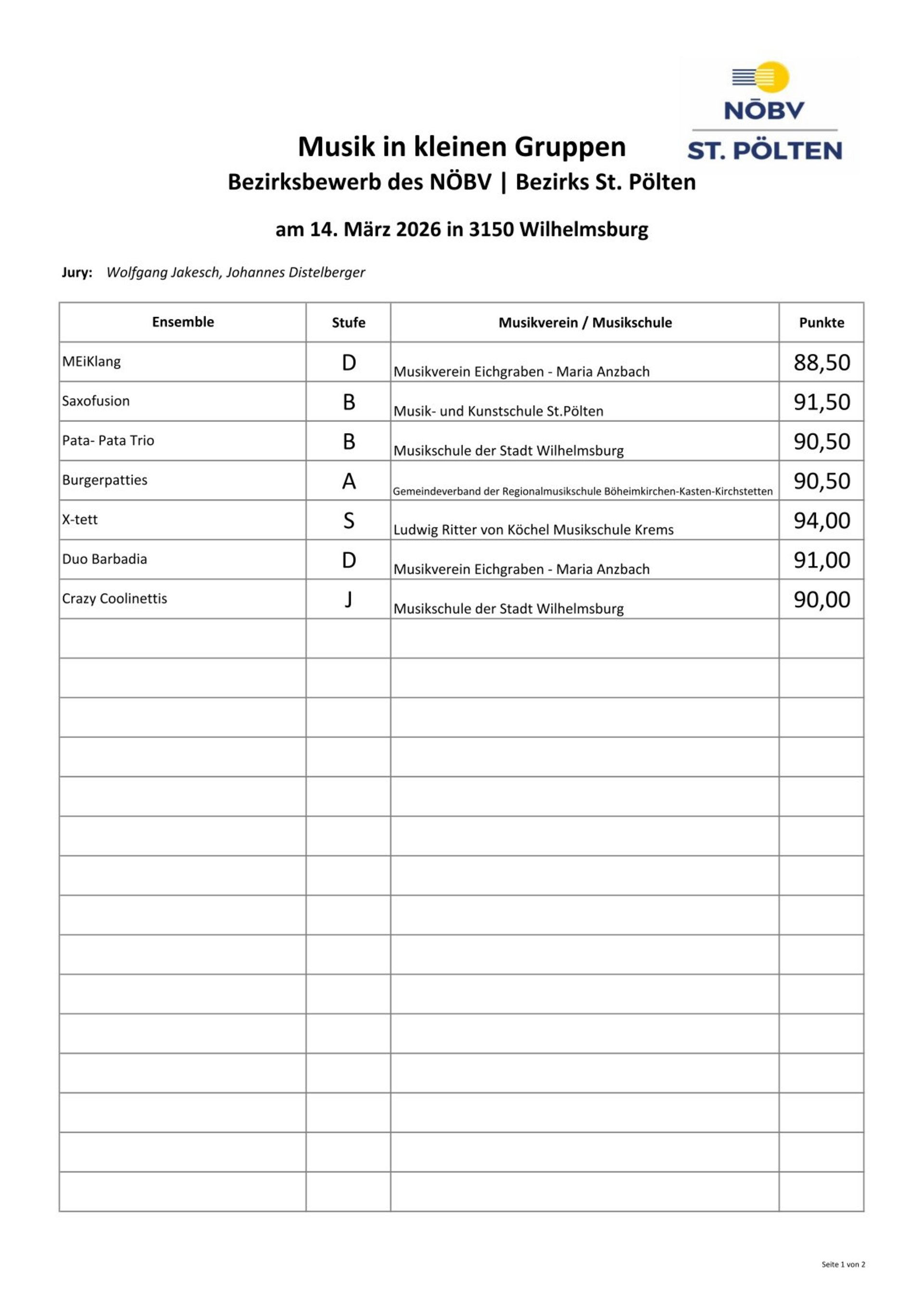 Das Holzbläserensemble X-tett (Alfred Agis, Agnes Frittum, Claudia Sajovic, Maria Leopold) konnte am Samstag, 14.03., beim Kammermusikwettbewerb in Wilhelmsburg (Bezirk St. Pölten) mit 94 Punkten in der Stufe S die Tageshöchstpunktezahl für die Musikschule Krems erspielen.