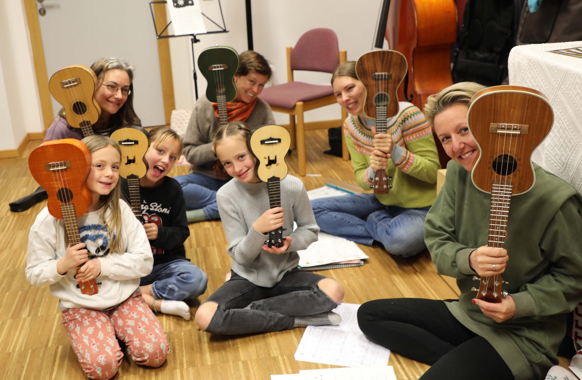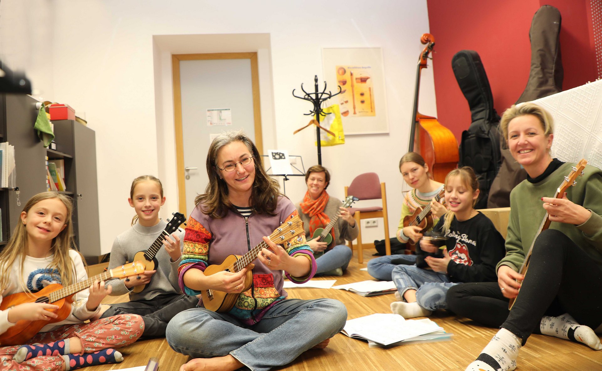 Fortgeschrittene in einer Gruppe gemeinsam. Wir achten dabei besonders darauf, dass diese Lerngemeinschaften bezüglich Niveau und Alter der Schüler:innen homogene Gruppen bilden. Ein spezielles Angebot ist die Eltern-Kind-Gruppe in Ukulele mit drei Kindern und drei Müttern. Lerngemeinschaften fordern einen anderen Einsatz als Einzelunterricht, da das Lerntempo sehr unterschiedlich sein kann. Das erfordert andere Methoden und neue Unterrichtsstrukturen.