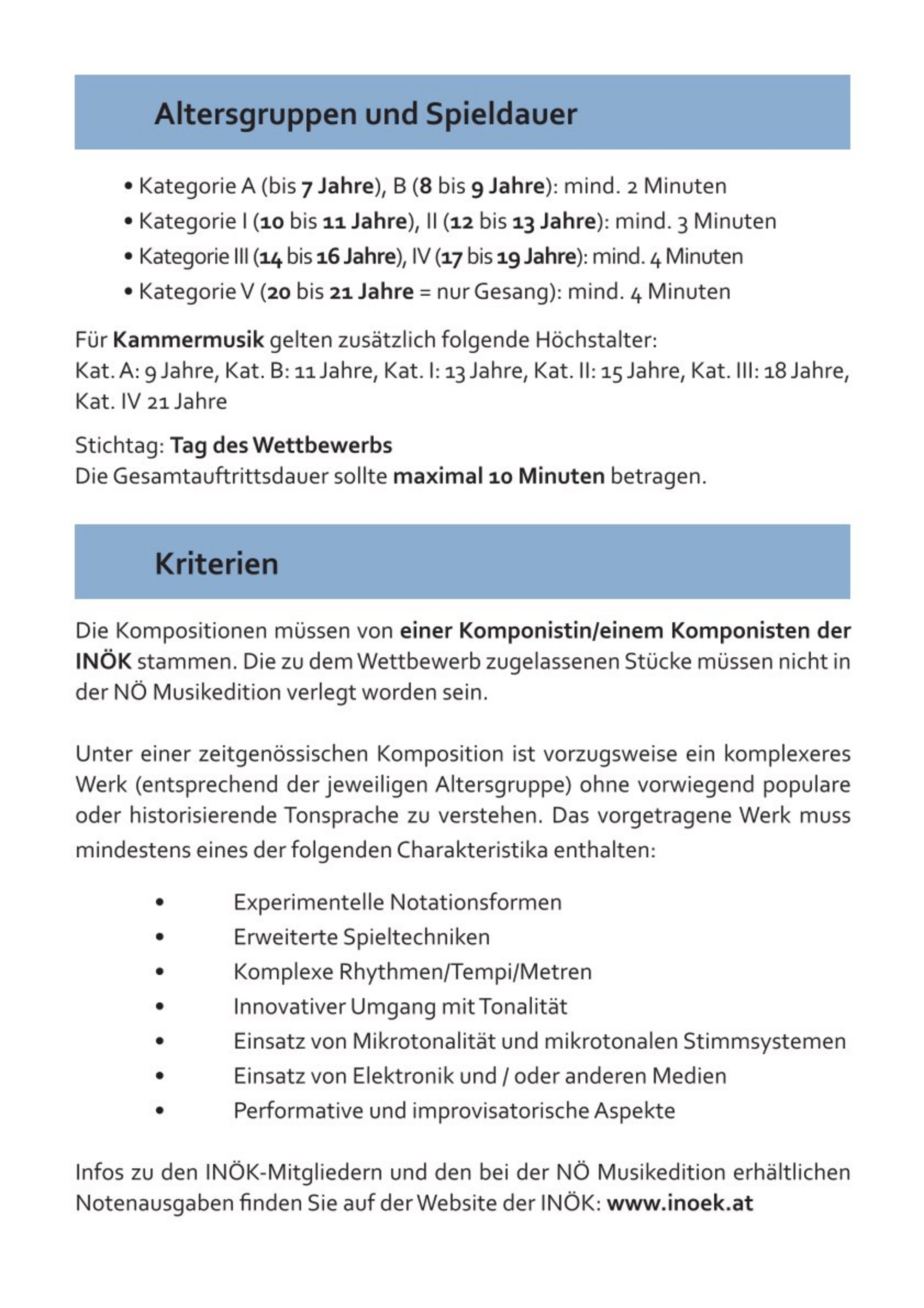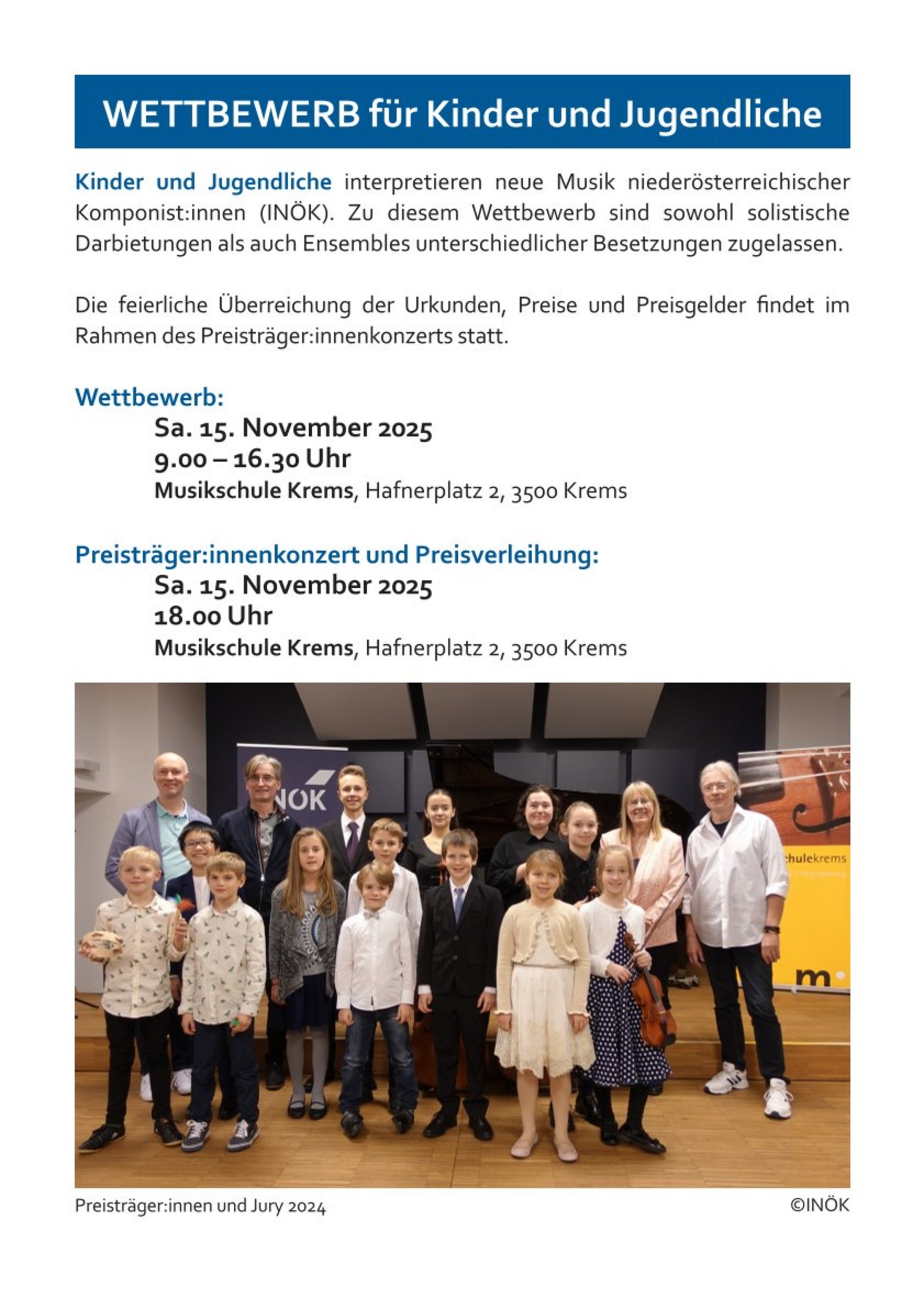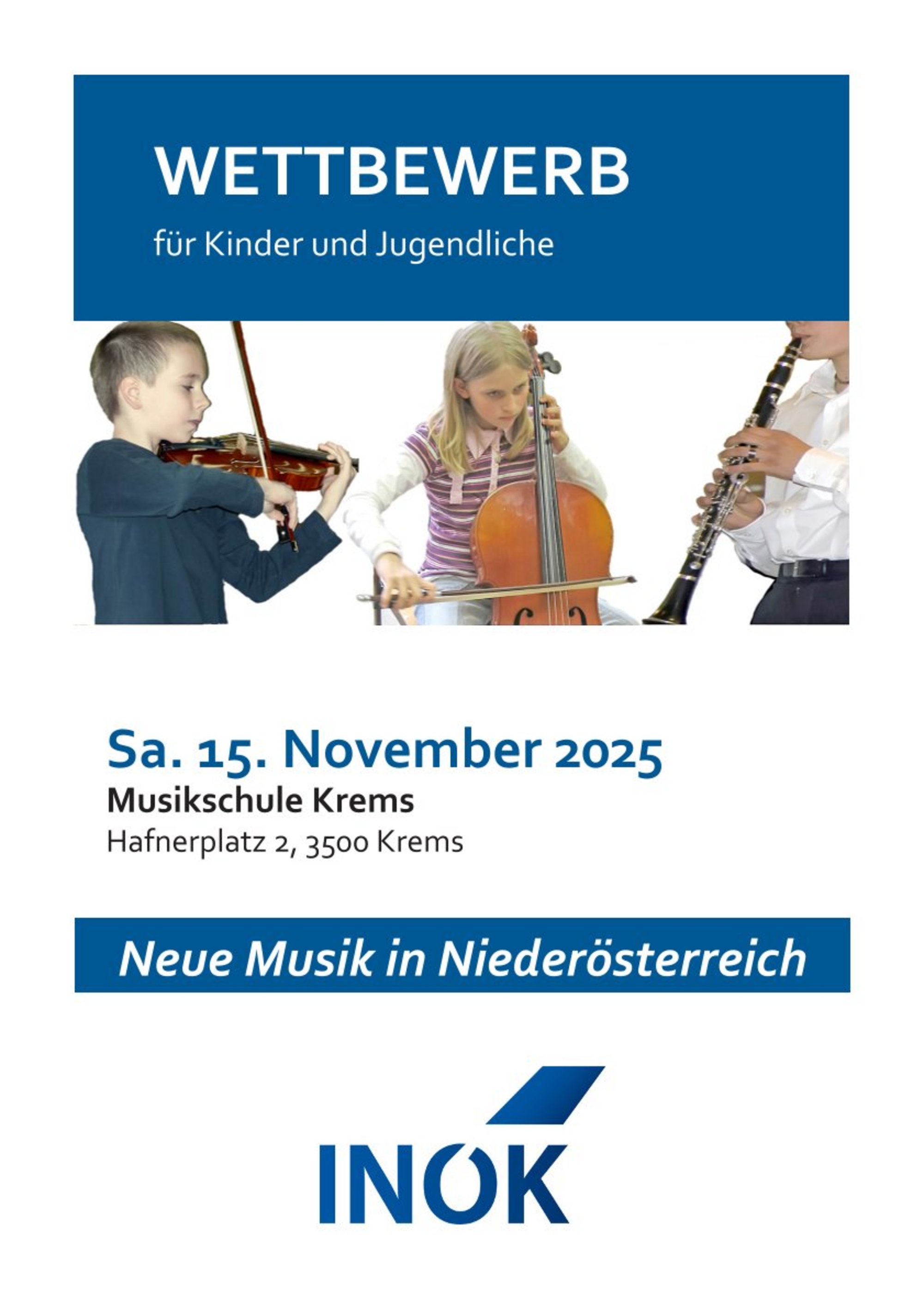 Kinder und Jugendliche interpretieren neue Musik niederösterreichischer Komponist:innen. Zum Wettbewerb sind sowohl solistische als auch Ensembles unterschiedlicher Besetzung zugelassen.