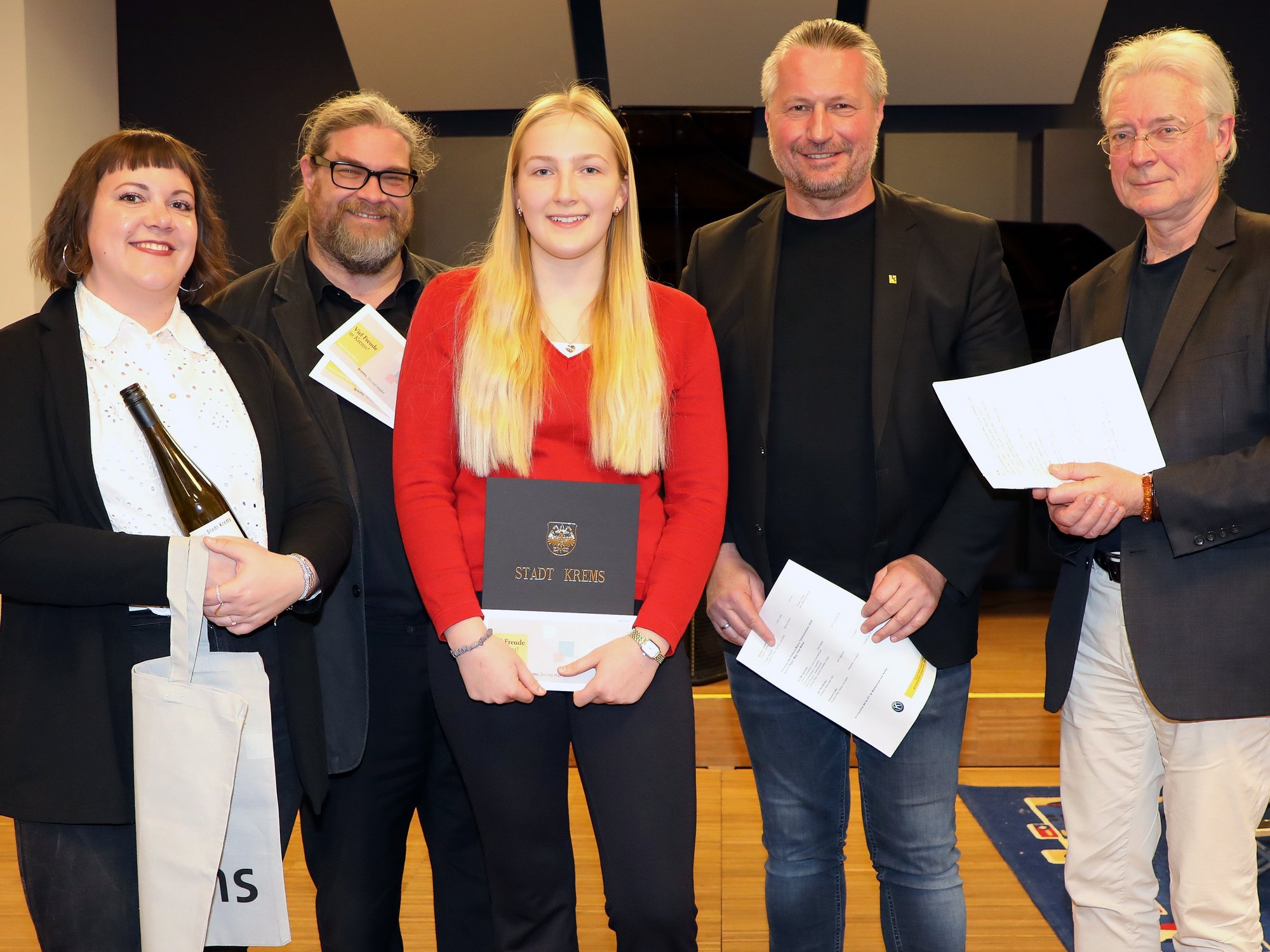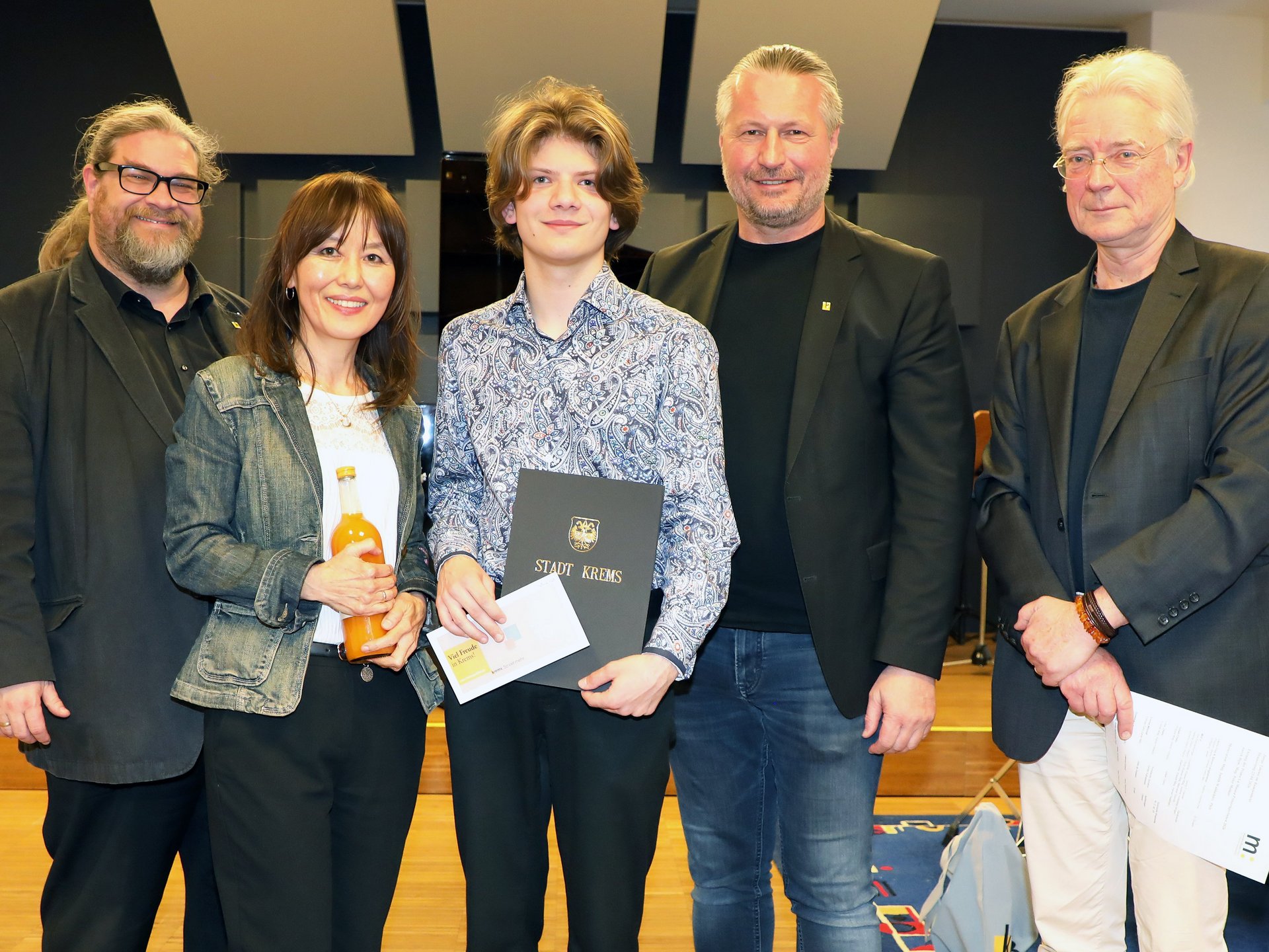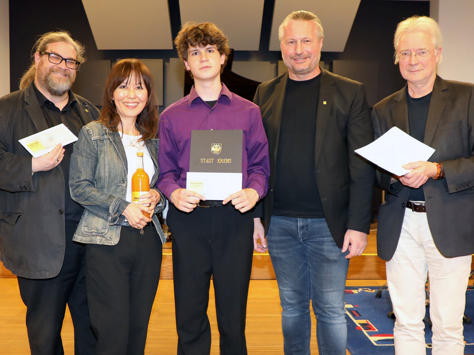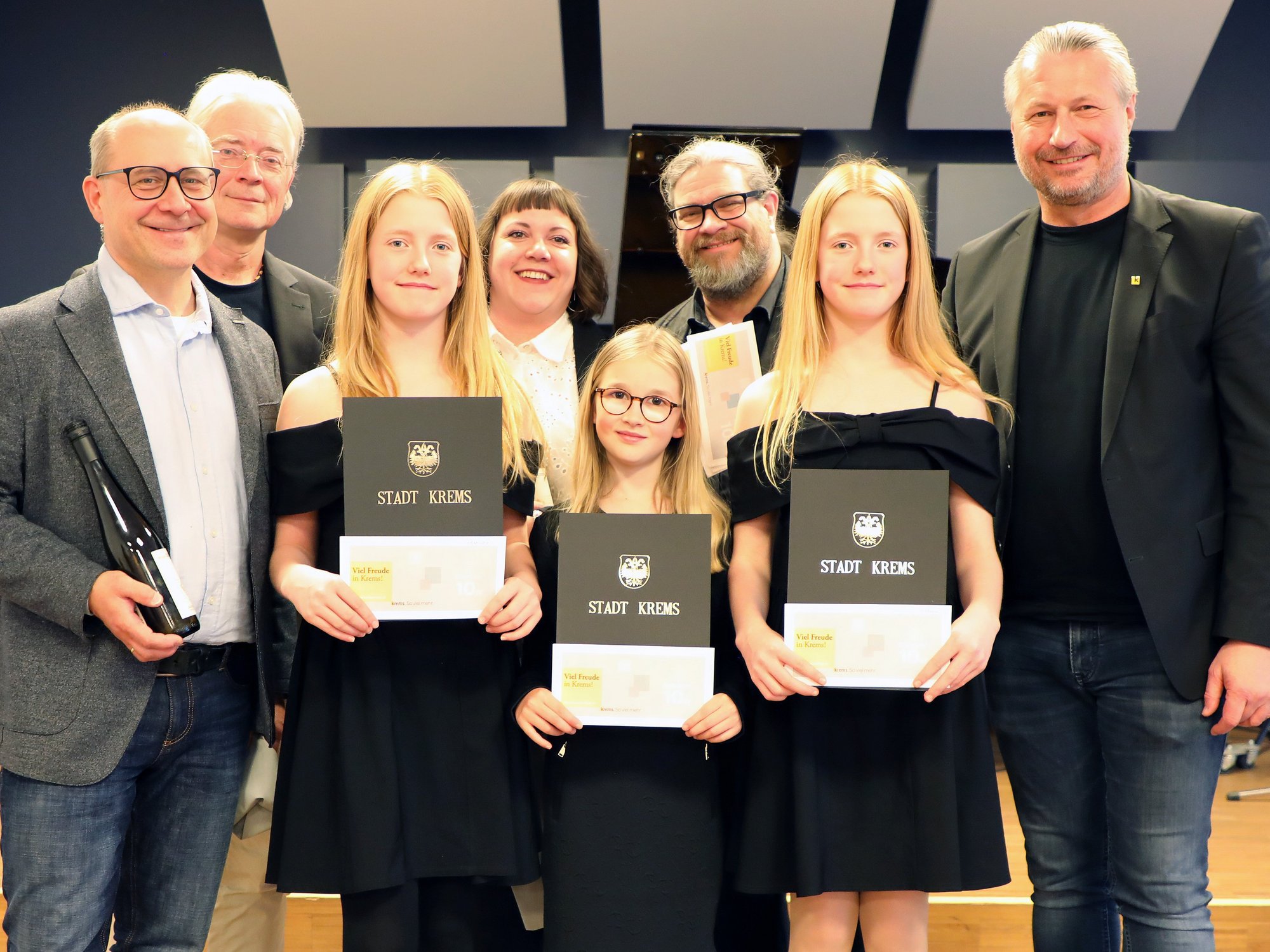 Unter dem Titel „Junge Talente auf dem Weg nach oben“ präsentierten zahlreiche vielversprechende Nachwuchskünstler:innen der Musikschule Krems ihr Können und begeisterten das Publikum mit einem vielseitigen Programm. Das Konzert bot auch den geeigneten Rahmen, um die erfolgreichen Teilnehmer:innen des Jugendmusikwettbewerbs „prima la musica“ vor den Vorhang zu holen: die Zwillinge Helena und Leonora Walch-Hegny, Livia Kienastberger, Emma Sonnleitner, Alexei Paul und Eduard Koller. „Unsere jungen Musiker:innen zeigen eindrucksvoll, wie viel Talent, Disziplin und Leidenschaft in Krems steckt. Die Erfolge bei ‚prima la musica‘ sind eine großartige Leistung und machen uns als Stadt sehr stolz“, betont Bürgermeister Peter Molnar, der den sechs Musiker:innen gemeinsam mit Musikschulleiter Hubert Pöll und Elternvereinsobmann Klaus Bergmaier zu ihren herausragenden Leistungen gratulierte.