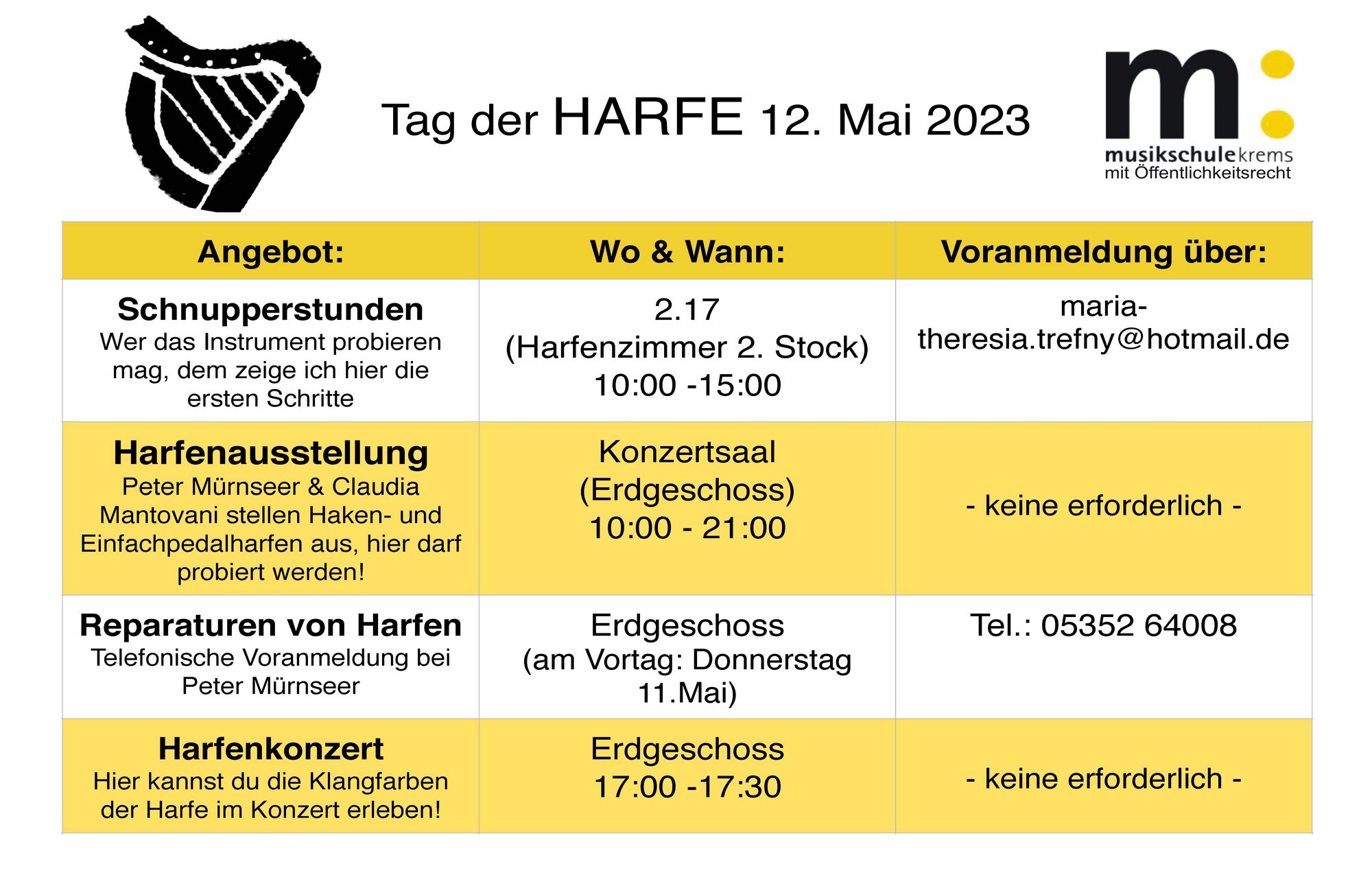 Am Donnerstag, 11.5., können Reparaturen von Harfen in Anspruch genommen werden. Dafür bitte telefonische Voranmeldung bei Peter Mürnseer unter 05352 64008.