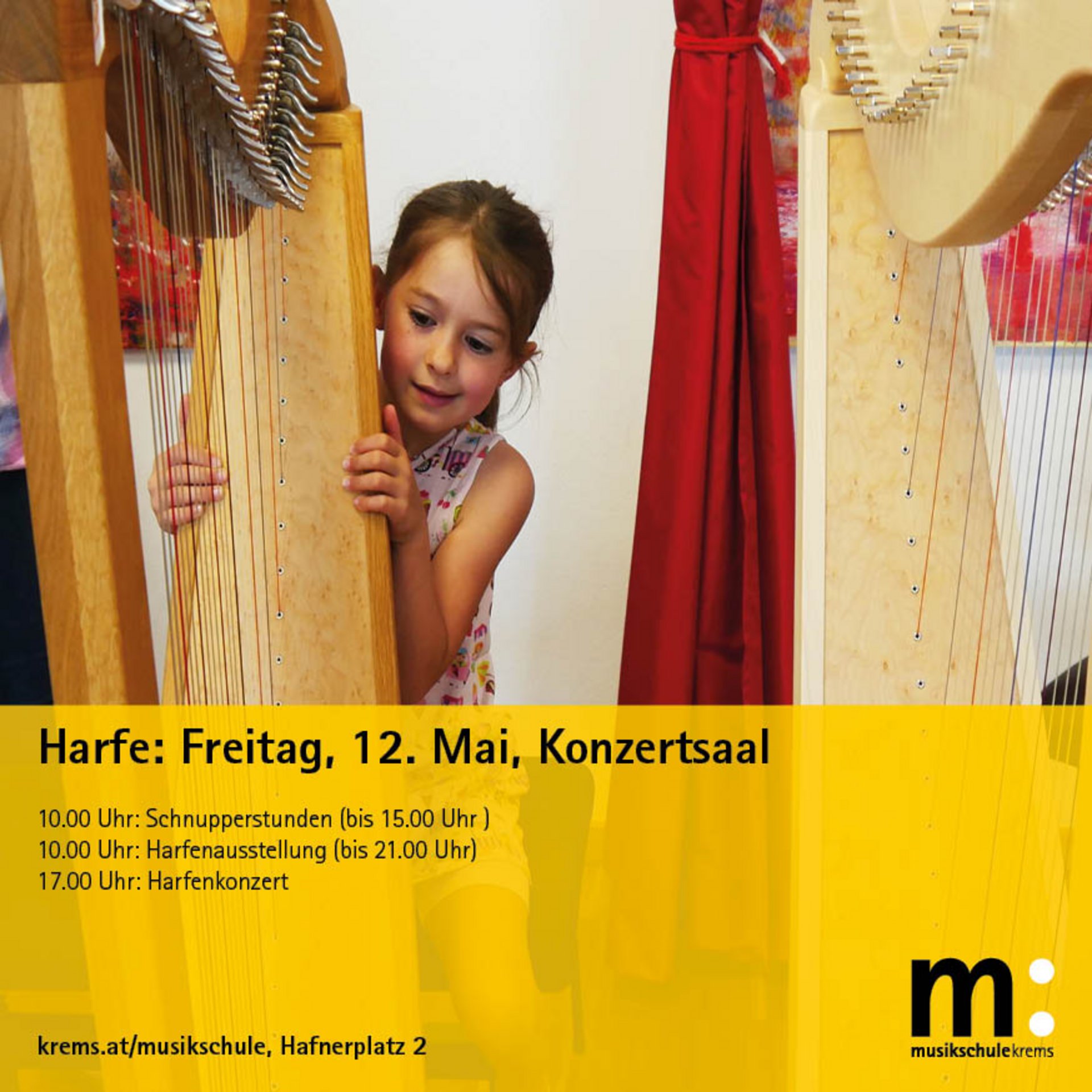 Von 10:00-21:00 findet eine Harfenausstellung in der Musikschule statt! Peter Mürnseer und Claudia Mantovani stellen Haken- und Einfachpedalharfen aus, hier darf probiert werden! Anmeldung ist nicht erforderlich.