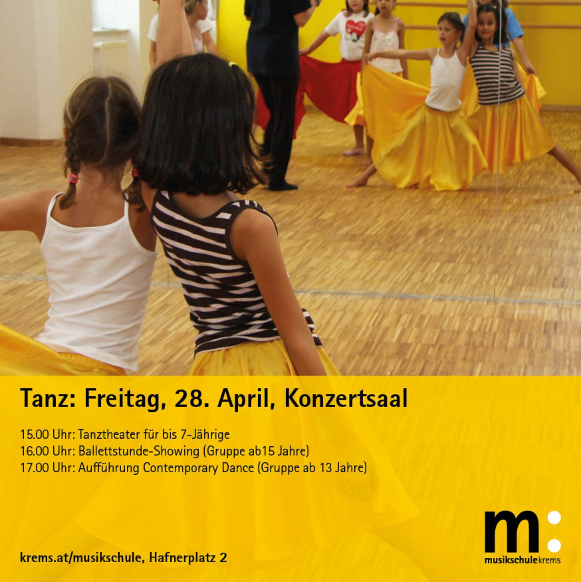 Um 15:00 ist "Das Schneckenhaus", ein Tanztheater-Gastspiel für Kinder ab 3 Jahre zu sehen, danach tanzen Ballett- und Contemporary Dance Schüler:innen der Musikschule sowie der Berufsausbildung des Europa Balletts St. Pöltens. Abschließend werden alle Zuschauer:innen dazu eingeladen gemeinsam zu tanzen.