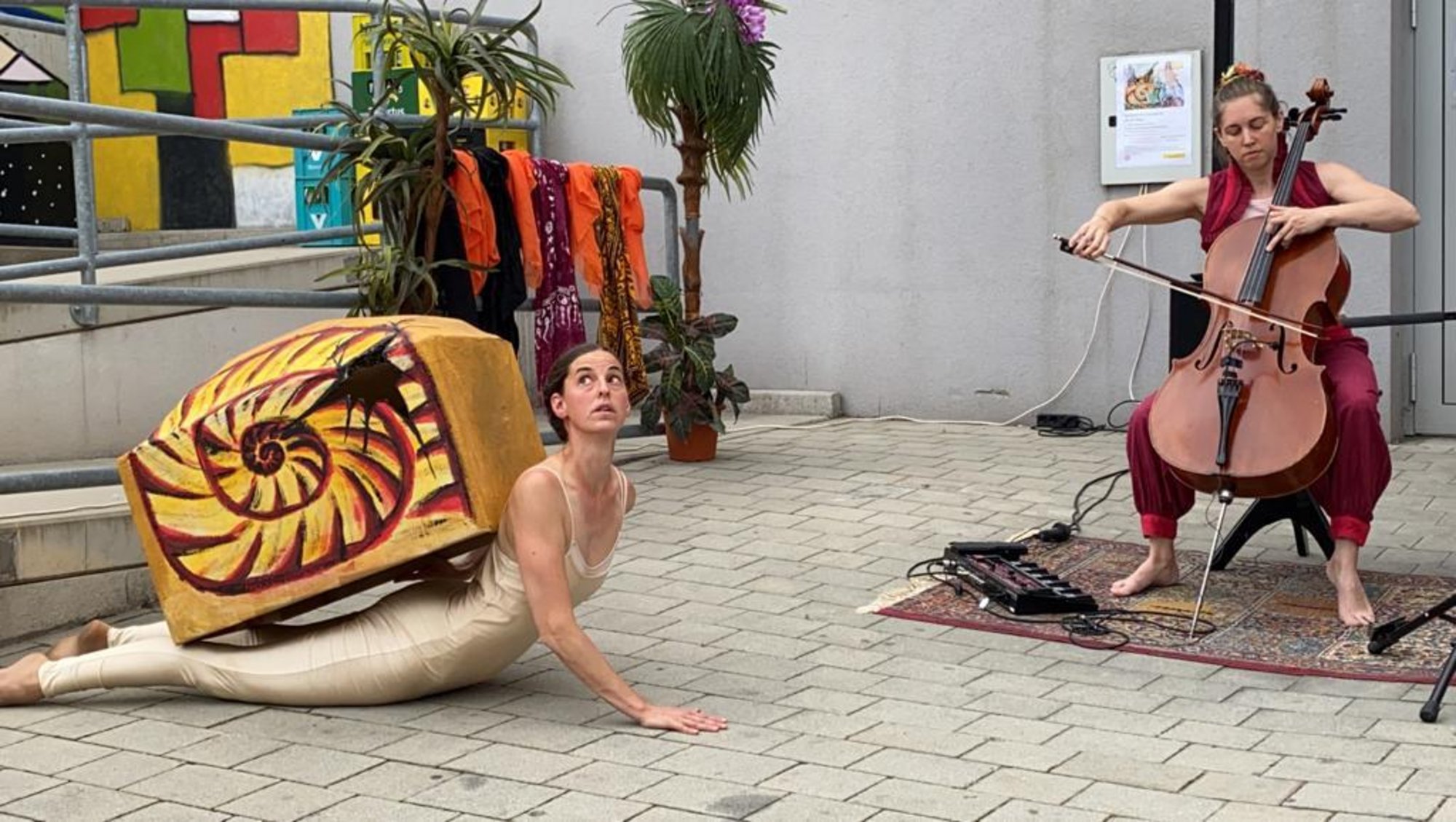 Das Stück handelt von einer Schnecke auf der Reise. Die Geschichte beginnt damit, dass die Schnecke ihr Haus verlassen muss, weil dieses ein großes Loch hat. Dadurch begibt sie sich in eine für sie ungewohnte Situation, denn als Schnecke nackt zu sein, fällt ihr gar nicht leicht. Vor den Augen der Zuschauer:innen entwickelt sich die am Anfang ängstliche und unsichere Schnecke durch emotionale Höhen und Tiefen zu einem zufriedenen Wesen. Die Musikerin unterstützt den Prozess durch subtile Klänge und feine Stimmungen, hervorgezaubert aus ihrem Cello. Den Schluss bildet ein interaktiver Teil. Dabei werden die Kinder eingeladen, das Gesehene noch einmal mit den Akteuren spielerisch nachzuempfinden.
