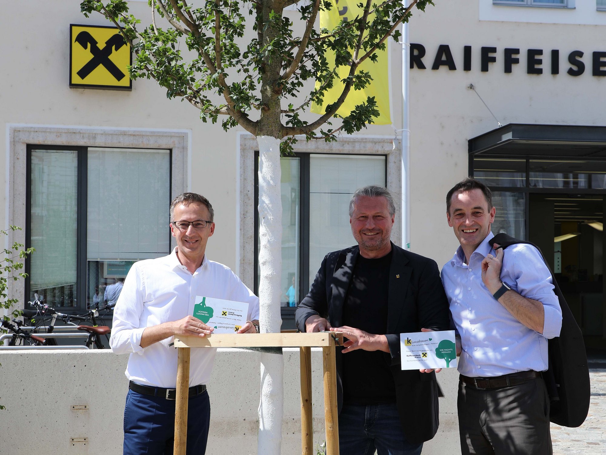 Denn der Dreifaltigkeitsplatz, der erst kürzlich entsiegelt und neugestaltet wurde, steht sinnbildlich für die gelungene Verbindung von Stadtentwicklung und Klimaschutz. Insgesamt wurden hier neun neue Feldahorne gepflanzt, darunter aktuell sieben Klimabäume, die nun offiziell übergeben wurden. Die Raiffeisenbank Krems, deren Zentrale sich direkt vor Ort befindet, übernahm die Patenschaft für vier Bäume. „Wir waren sehr gerne bereit, einen Beitrag zur Neugestaltung des Platzes leisten“, betonte Direktor Franz Kurzreiter und bedankte sich für die gelungene Umsetzung. Nur wenige Meter weiter entfernt steht der Klimabaum von Vizebürgermeisterin Eva Hollerer und Bürgermeister-Sekretärin Gaby Heindl. Beide hatten anlässlich ihrer runden Geburtstage auf Geschenke verzichtet und stattdessen um Spenden gebeten. Das Geld verwendeten sie schließlich nicht nur für eine Baum-Patenschaft, sondern bedachten auch den städtischen Sozialfonds mit einem großzügigen Betrag. Mit ihrer Patenschaft setzt sich auch die Kremserin Ingrid Winter für Umwelt- und Klimaschutz ein. Die Patenschaft für den 50. Klimabaum übernahm Peter Ebner aus Wien – ein KSC-Fan mit familiären Wurzeln in Krems.