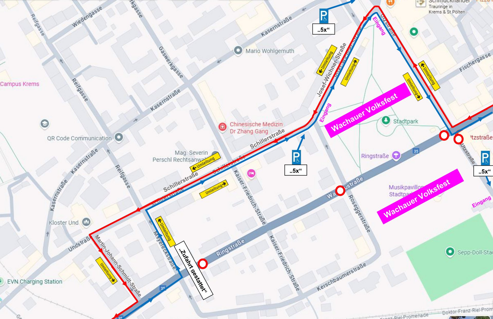 Von Donnerstag, 14. August bis Freitag 5. September kommt es aufgrund des Wachauer Volksfestes zu Verkehrsmaßnahmen im Stadtgebiet. Mehrere Straßenzüge rund um das Festgelände werden gesperrt oder nur eingeschränkt befahrbar sein.
