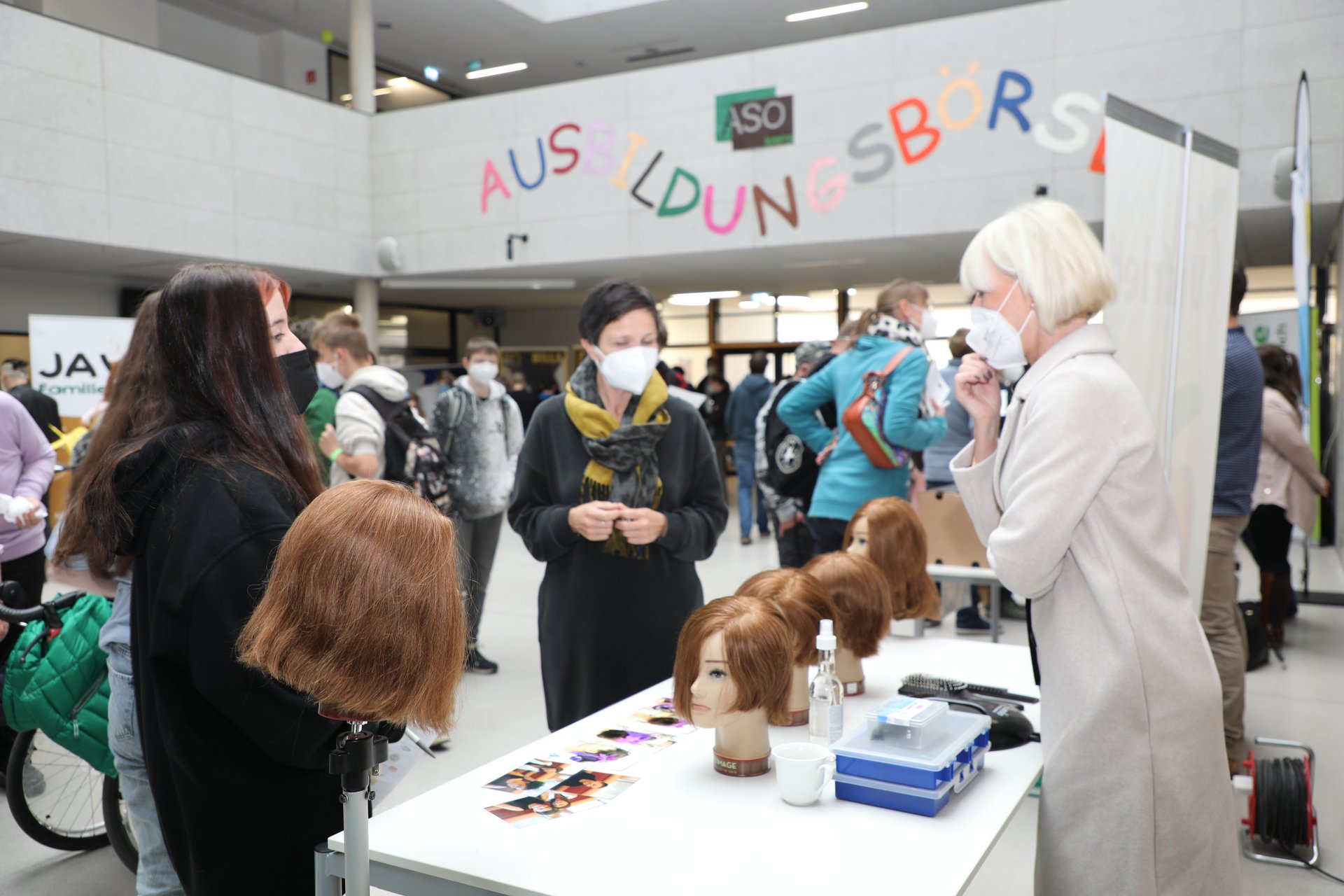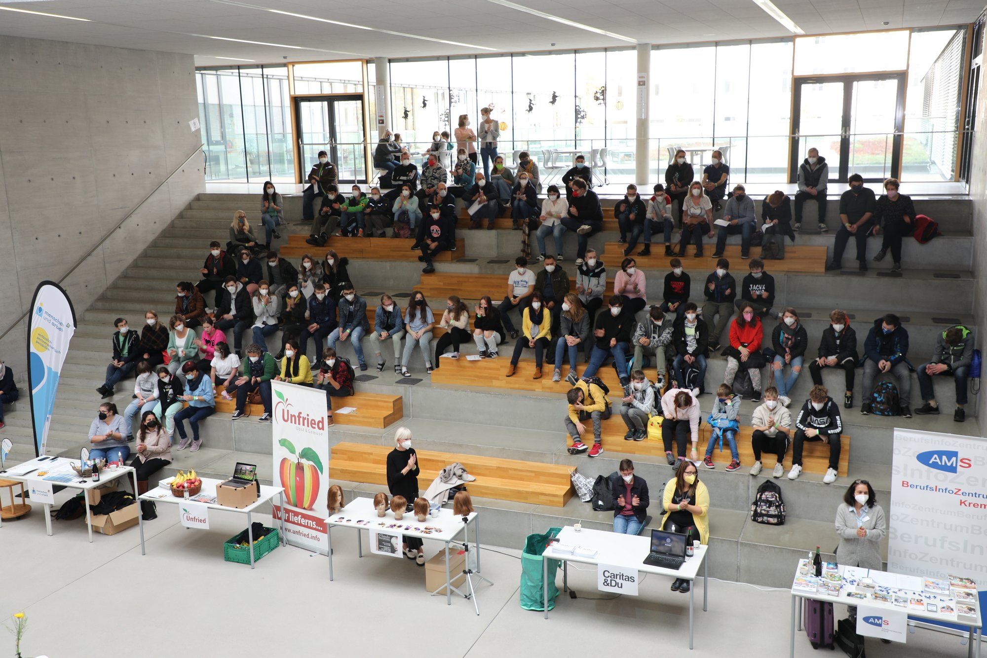 Zahlreiche Eltern waren ins Schulzentrum Krems gekommen, um sich gemeinsam mit ihrem Nachwuchs über Chancen und Möglichkeiten einer beruflichen Ausbildung zu informieren. In der Aula präsentierten sich mehr als ein Dutzend Unternehmen mit ihren Qualifizierungsangeboten, ermutigten die jungen Menschen, das Gespräch zu suchen und sich zu informieren, und vereinbarten an Ort und Stelle so manchen Schnuppertag. Die Berufsfelder reichten vom Gastgewerbe über Bäckerei, Fahrradmechaniker, Gärtnerei bis zum Friseur- und Einzelhandelsunternehmen. Als unterstützende Einrichtungen stellten sich auch Lehrlingswerkstätten der Caritas, der Lebenshilfe usw. mit ihren Ausbildungsprojekten vor. Die städtischen Betriebe waren mit der Stadtgärtnerei als wichtige Arbeitgeberin und Ausbildnerin vertreten. In vielen Gesprächen kamen Unternehmer und junge Menschen einander näher – Unsicherheiten, Berührungsängste und Vorteile konnten auf diese Weise abgebaut werden.