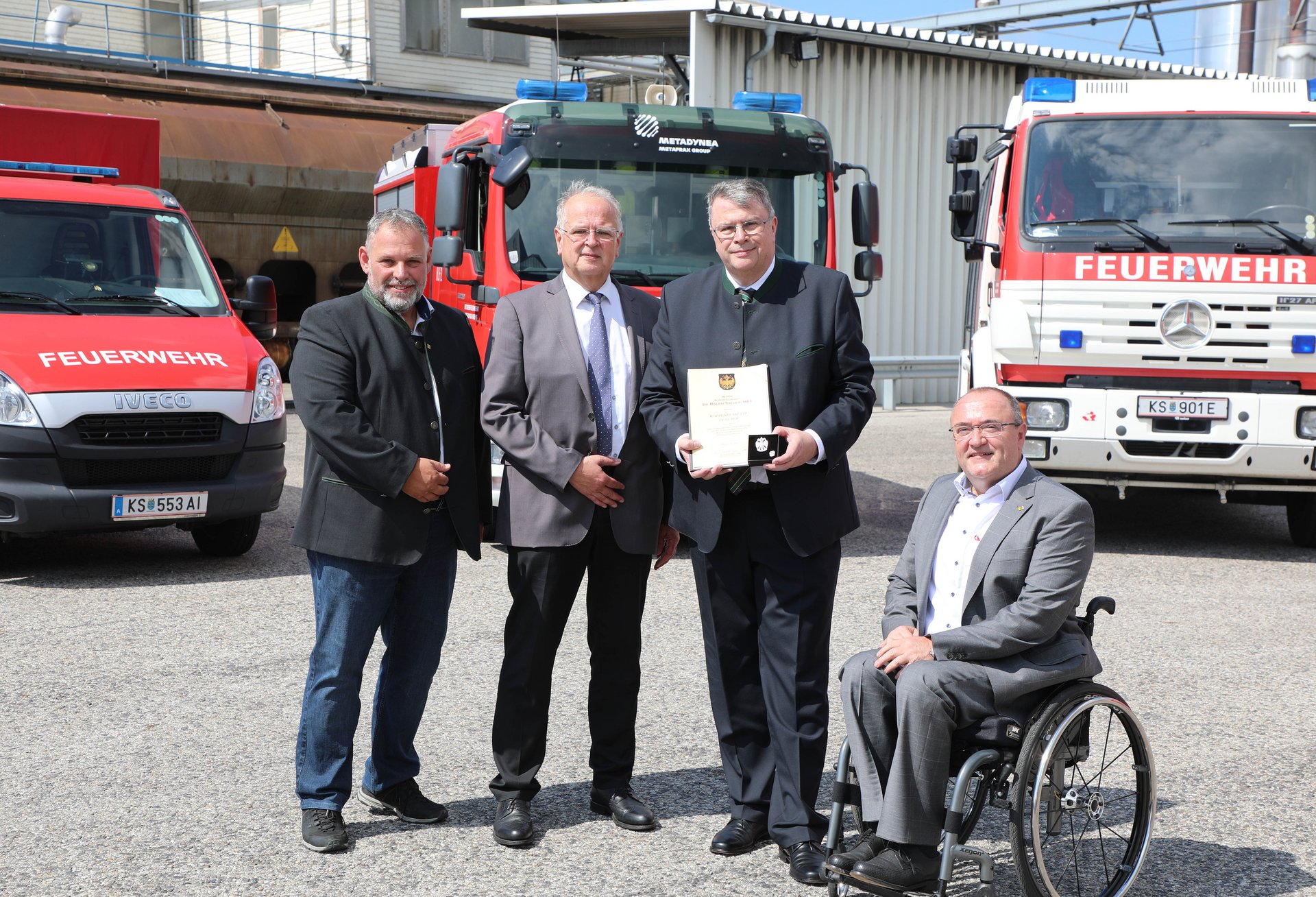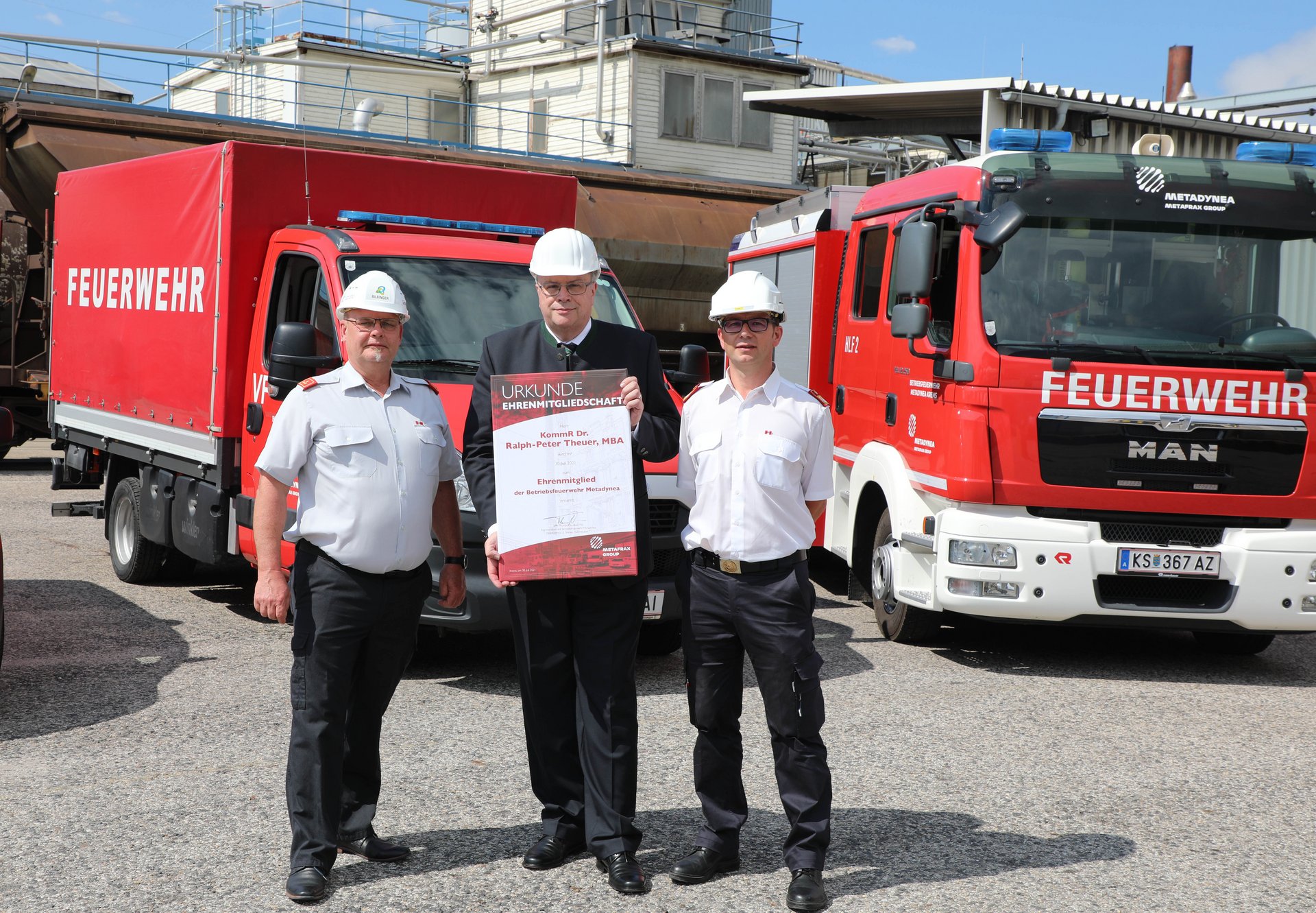 Im Rahmen der Feierlichkeit fand auch die Verabschiedung des Geschäftsführers der Metadynea Austria GmbH, Herrn Dr. Ralph Theuer und die Vorstellung seines Nachfolgers, Herrn Dr. Michael Kunz statt. Als Anerkennung für seinen Einsatz und sein Engagement wurde Herr Dr. Ralph Theuer zum Ehrenmitglied der Metadynea Betriebsfeuerwehr ernannt. Die Stadt Krems verlieh ihm für seinen Beitrag zur Entwicklung des Wirtschaftsstandortes Krems an der Donau die Wappenplakette in Silber.