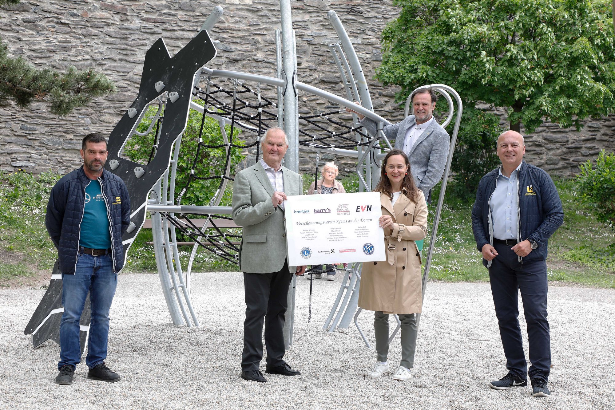 Foto: Begutachtung des neuen Klettergeräts im Bienenpark: Werner Mistelbauer vom Stadtgartenamt, Herfried Pauser und Herta Miesbauer (Verschönerungsverein), Doris Berger-Grabner, StR Werner Stöberl, Roland Dewisch (von links)