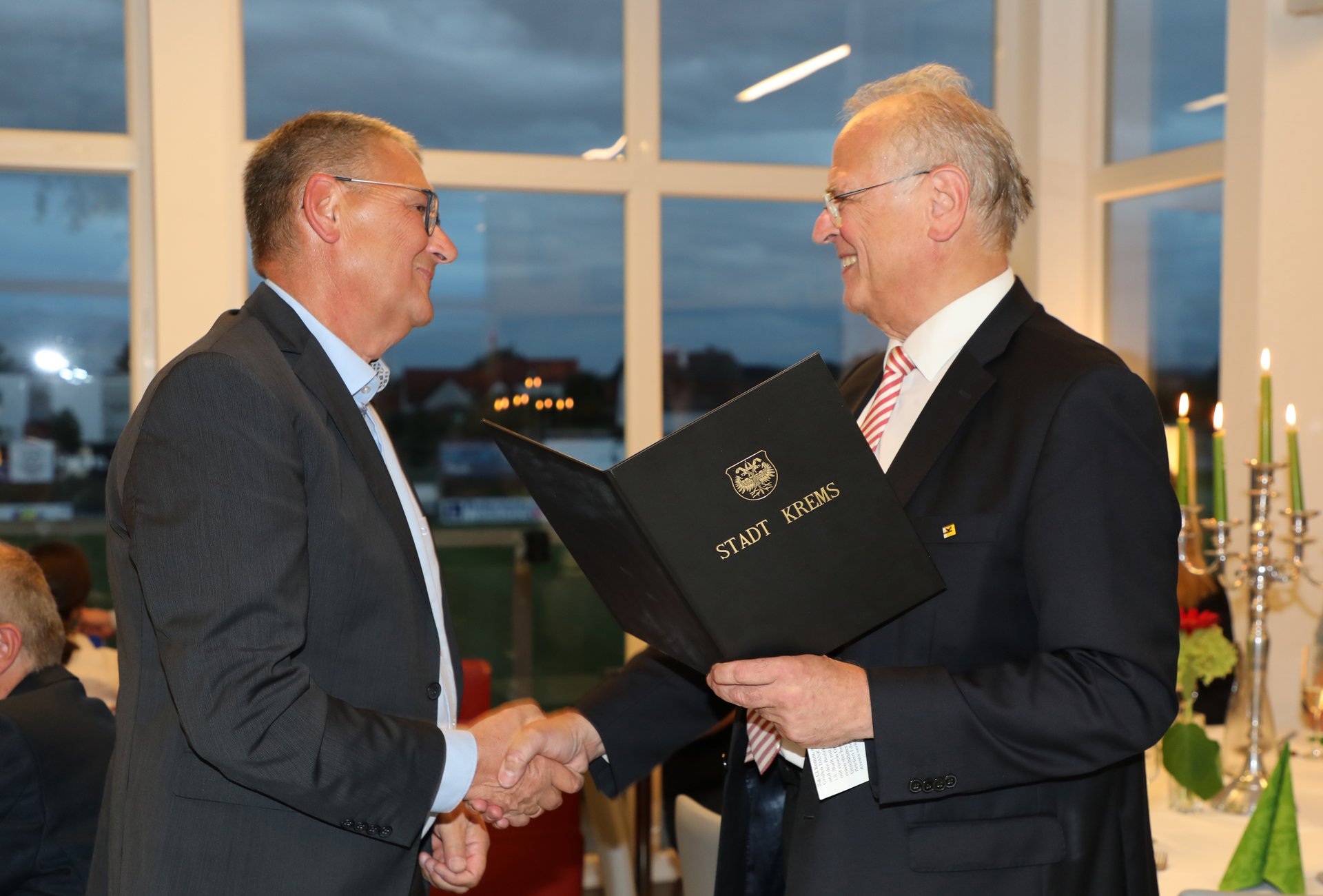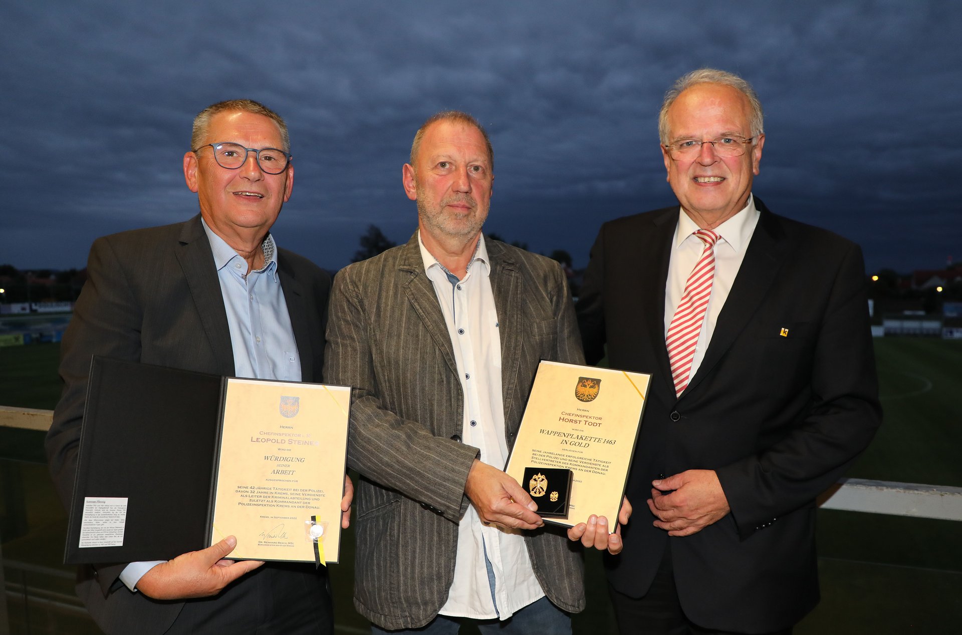Für die langjährigen Tätigkeiten bei der Polizei sind Chefinspektor i.R. Leopold Steiner und Chefinspektor Horst Todt vom Bürgermeister Dr. Reinhard Resch geehrt worden. „Um die Sicherheit in der Stadt Krems und ein friedvolles Miteinander haben sich die Chefinspektoren stets bemüht. Mein aufrichtiger Dank gilt für deren Verdienste und für die sehr gute Zusammenarbeit “, betont der Stadtchef bei der Übergabe der Wappenplakette in Gold für Horst Todt.