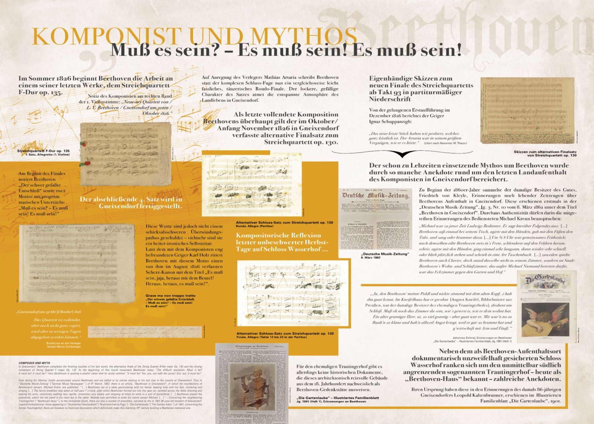 Auf vier Schautafeln an der Fassade dieses musikhistorischen Gebäudes werden der Aufenthalt, der Alltag, die Werke und das Nachleben des ‚Mythos Beethoven‘ illustriert.