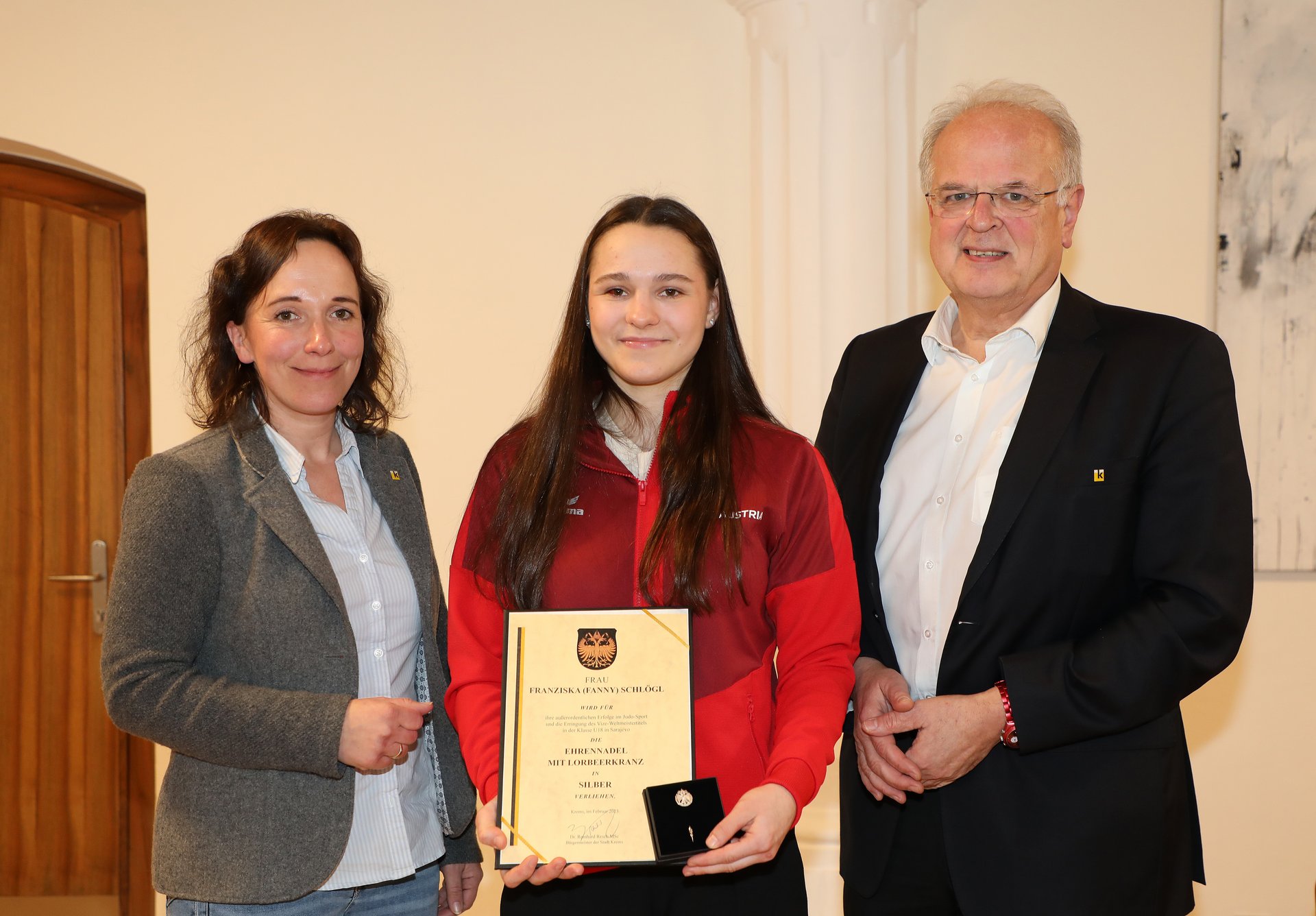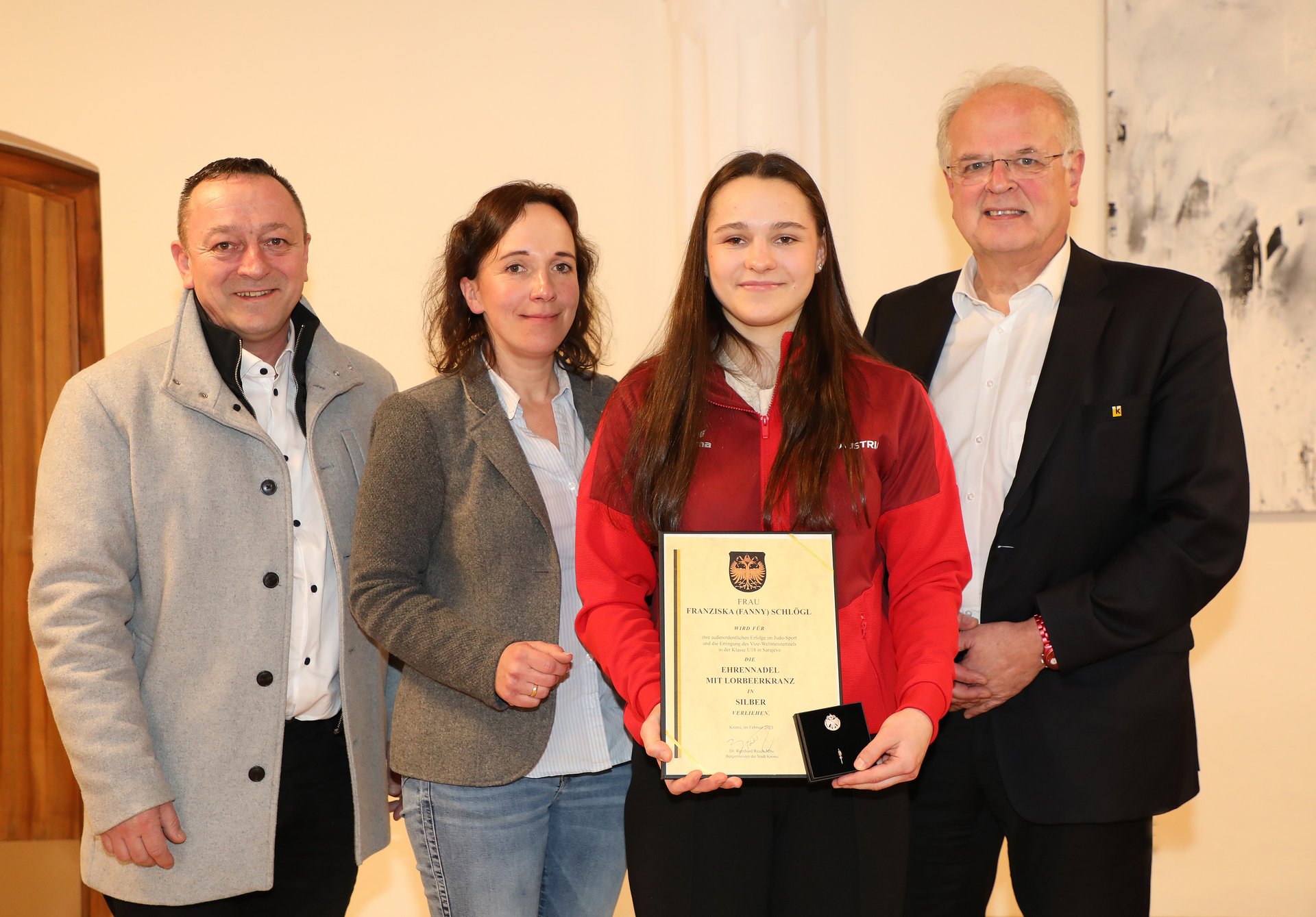 Foto: Franziska Schlögl (2. von rechts) mit Bürgermeister Dr. Reinhard Resch, Sportstadträtin Bernadette Laister (und Vater Andreas Schlögl).