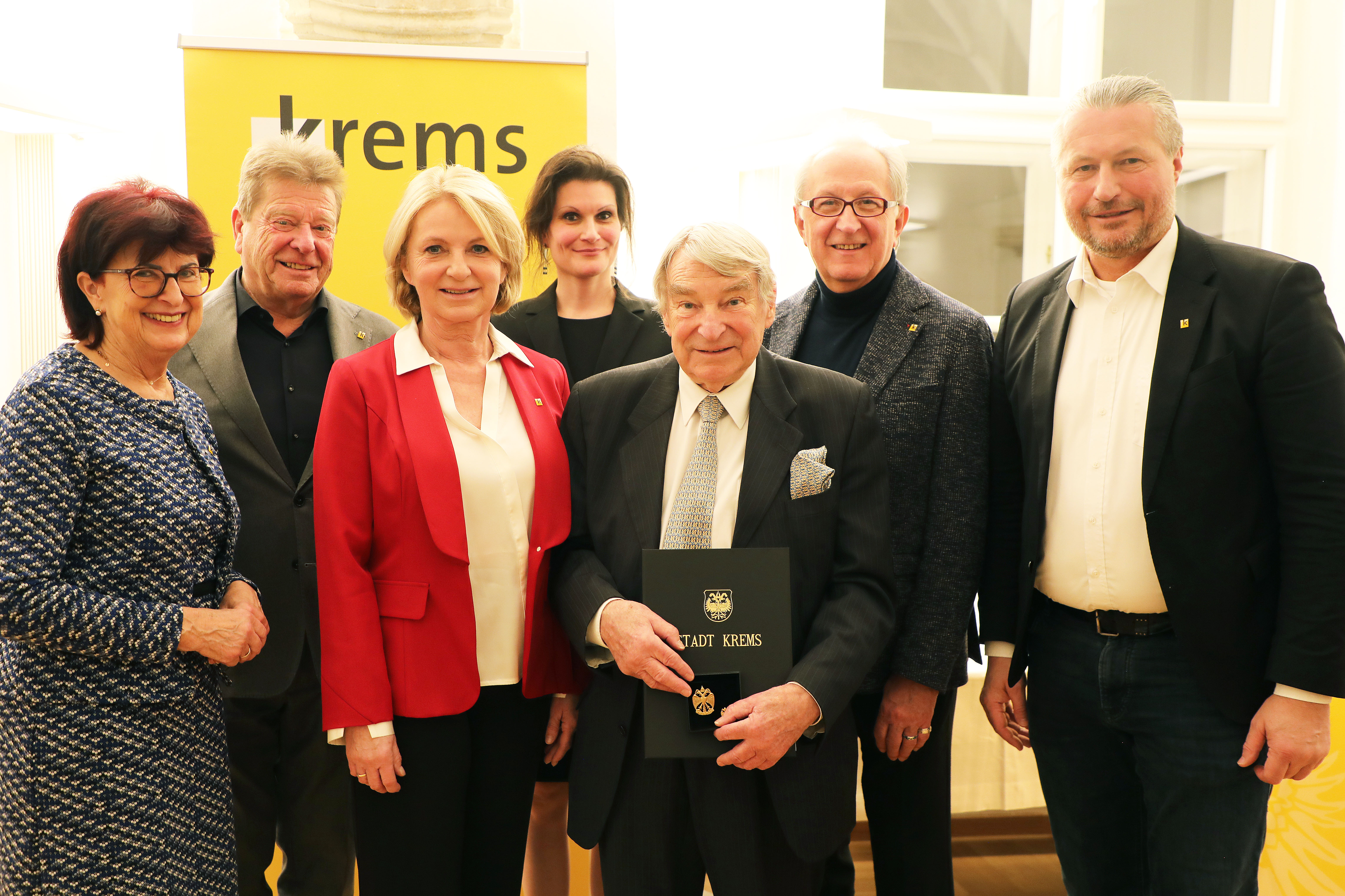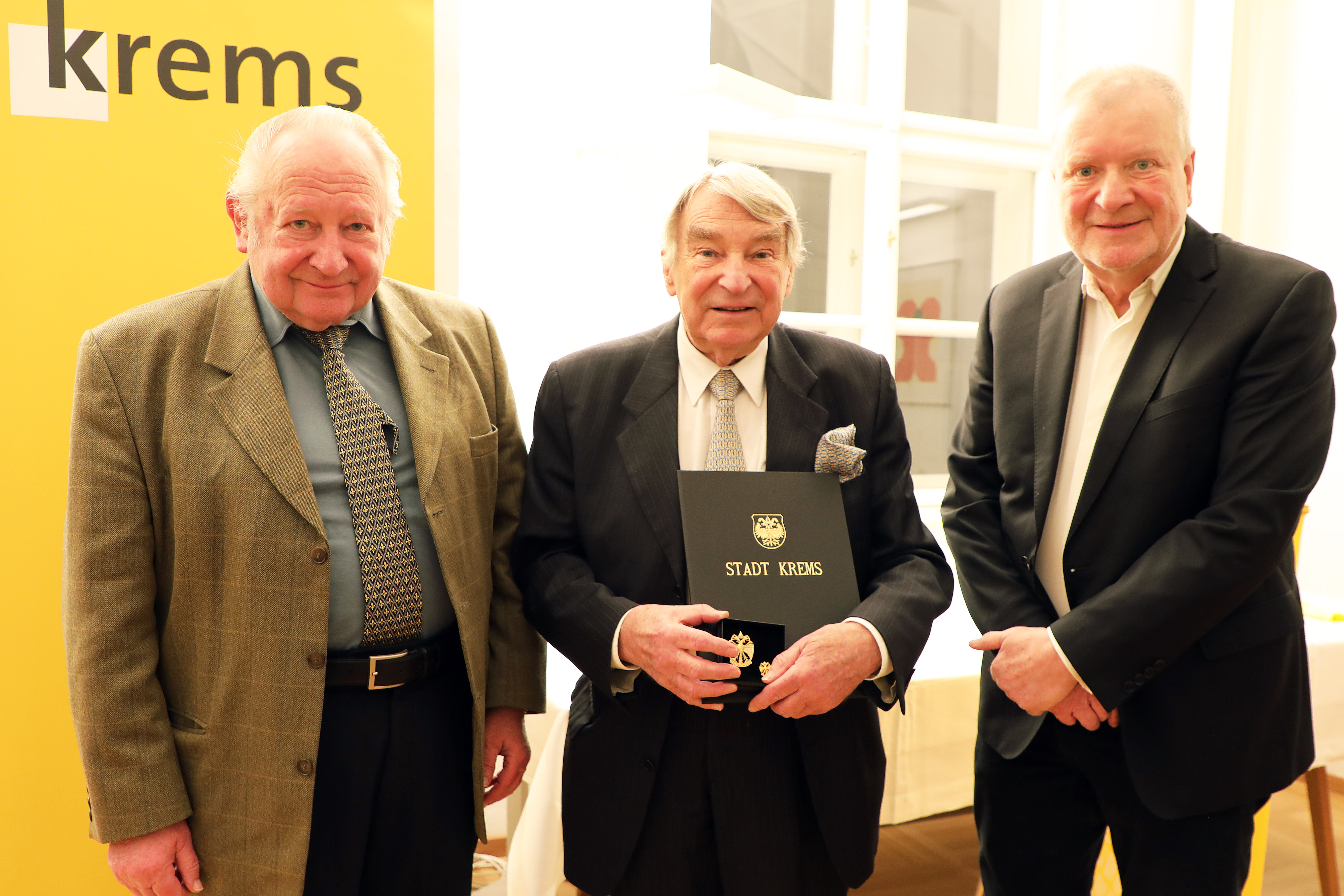 Einstimmig hat der Stadtsenat die Verleihung der Wappenplakette der Stadt Krems in Gold an den früheren Universitätsprofessor und Mediziner Günter Krejs beschlossen. Beim Festakt im Rathaus hob Bürgermeister Peter Molnar die herausragenden Leistungen des Geehrten für Wissenschaft, Medizin und für seine Heimatstadt Krems hervor: „Sie haben Krems wirklich in die ganze Welt getragen.“ Die Verleihung der Wappenplakette in Gold sei für die Stadt „eine große Ehre“, betonte Molnar und bedankte sich bei Günter Krejs für sein jahrzehntelanges Wirken. Auch Vizebürgermeisterin Eva Hollerer gratulierte Günter Krejs zur hohen Auszeichnung und wünschte ihm alles Gute für die Zukunft.