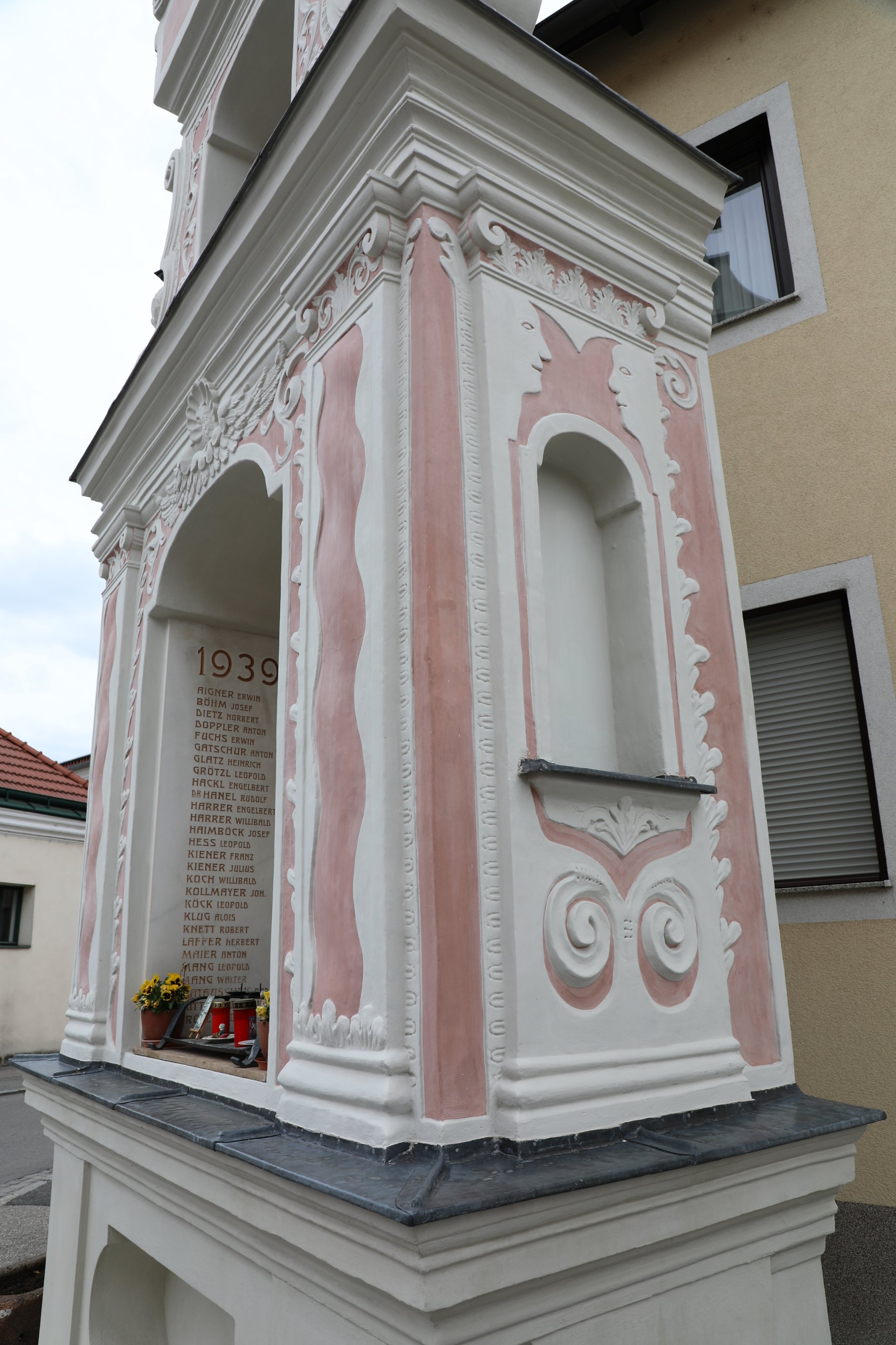 Der Bildstock stammt ursprünglich aus dem späten 17. Jahrhundert und wurde 1918 zum Kriegerdenkmal umgewidmet. Im Zuge der Restaurierungsarbeiten wurden die Oberfläche gereinigt, fehlender Putz ergänzt und das Denkmal mit Kalkfarbe neu gestrichen. Darüber hinaus wurde im unteren Bereich des kleinen Glockenturms eine neue Holzkonstruktion mit Gefälle eingebaut und die Blechabdeckung erneuert. Um Schäden durch Regenwasser vorzubeugen, sorgen nun unauffällige Kastenrinnen und Wasserabläufe für eine bessere Wasserableitung. Dadurch sollen unschöne Rinnspuren künftig vermieden werden.