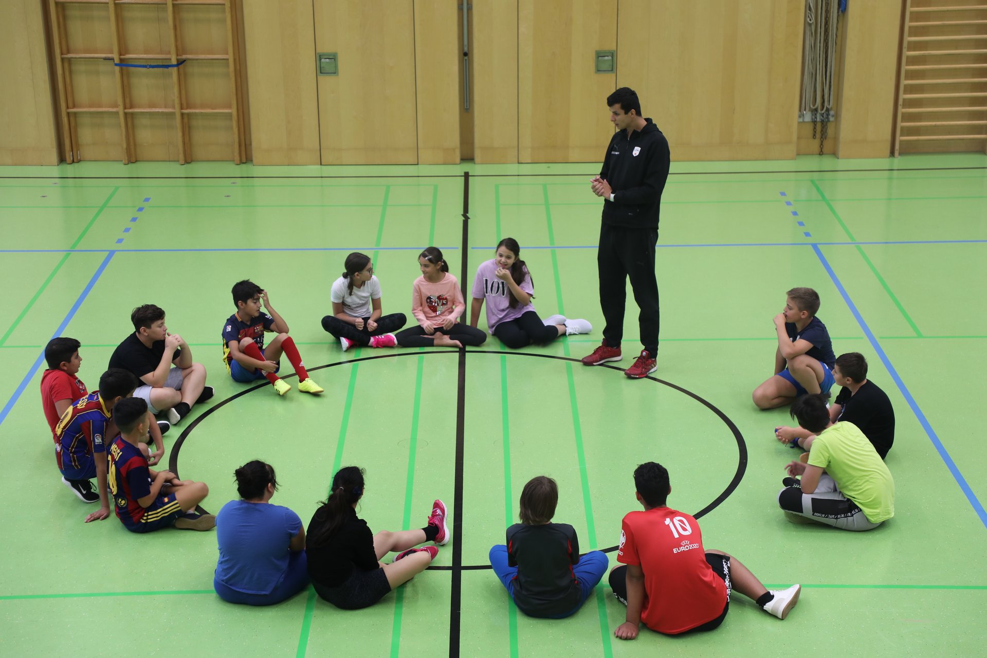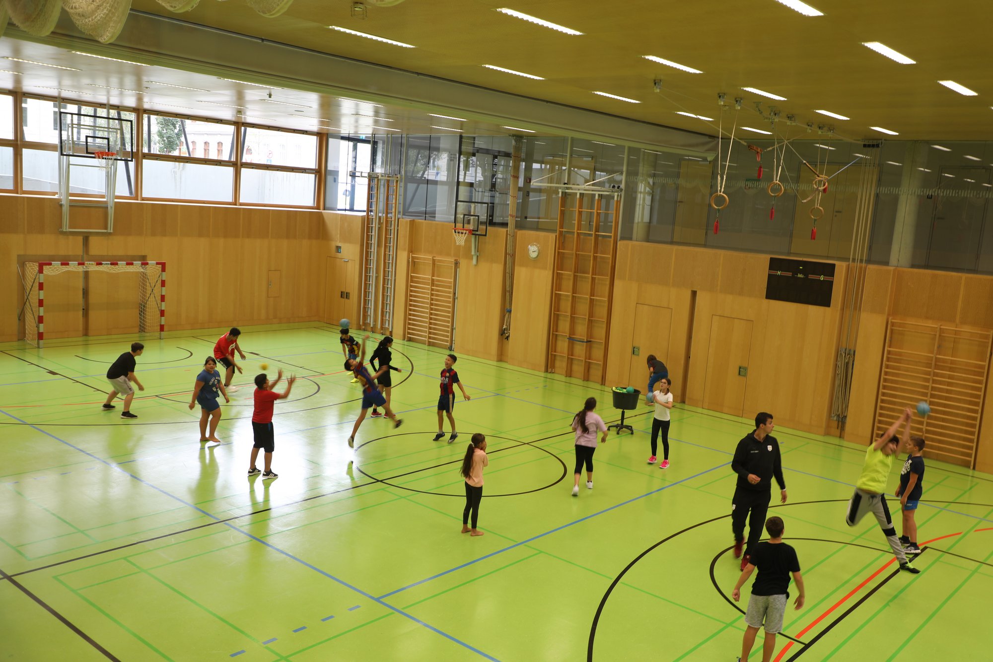 Foto 1 und 2: Neues Sportangebot an der Mittelschule Krems: die Handballgruppe mit Handballprofi Gabor Hajdu.