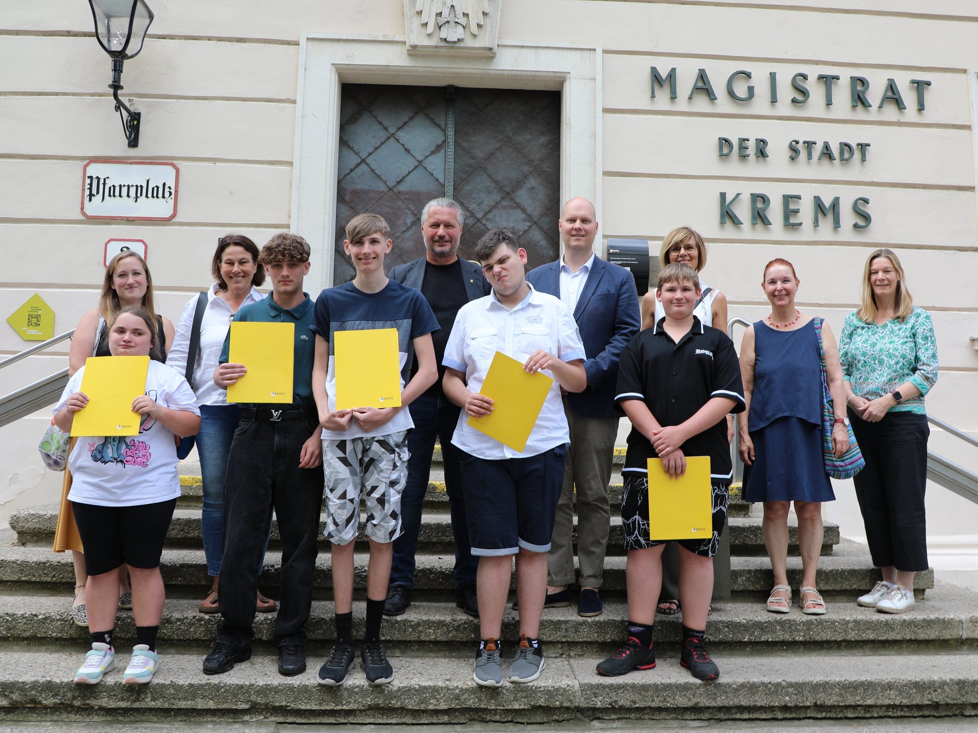 Zum ausgezeichneten Abschluss der Mittelschule Krems gratulierte der Stadtchef Julian Pöhn, Nicoleta Ciucu, Mia Steindl und Selima Yusupova. Ebenfalls mit ausgezeichnetem Erfolg verlassen zwölf Burschen die Polytechnische Schule Krems: Leon Gerstl, Conner Raab, Leo Sun, Danial Khammoo, Martin Pogonin, Maximilian Mörth, Adrian Aubrunner, Julian Buchsbaum, Daniel Graf, Tobias Schweighofer, Tian Zhang und Oliver Huth. Acht Jugendliche haben ihre Pflichtschulzeit an der Kleingruppenschule Krems (vormals Allgemeine Sonderschule) abgeschlossen: Elias Böck, Kevin Schmelz, Jan Bauer, Medina Zukic, Dennis Maringer, Daniel Maringer, Amir Zakriev und Lisa Staufer.