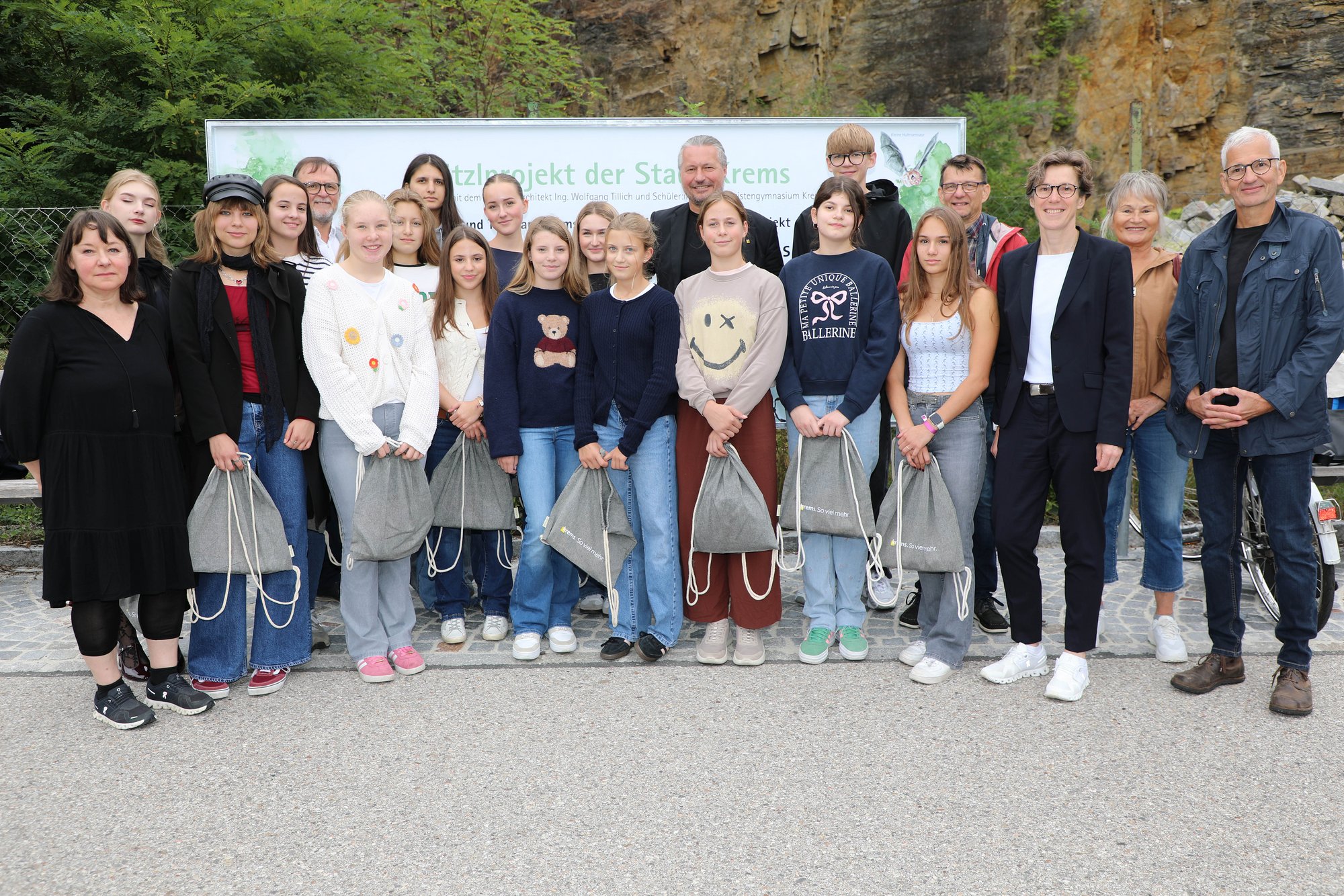 Auf Initiative von Anrainer Wolfgang Tillich entstand in der Ufergasse ein Erholungsraum für Einheimische und Gäste – und das fast zum Nulltarif. Seit Sommer 2024 laden entlang beider Straßenseiten mehrere Sitzgelegenheiten und Grünflächen zum Verweilen ein. Das Besondere daran: Sämtliche Materialien stammen aus dem angrenzenden Steinbruch und wurden für ihre neue Bestimmung upgecycelt. Heuer kamen im Frühjahr noch vier neue Klimabäume auf dem Steinbruch-Areal dazu. Komplettiert wird das Projekt nun durch eine große Schautafel, welche die am Kremsfluss heimischen Tier- und Pflanzenarten darstellt.