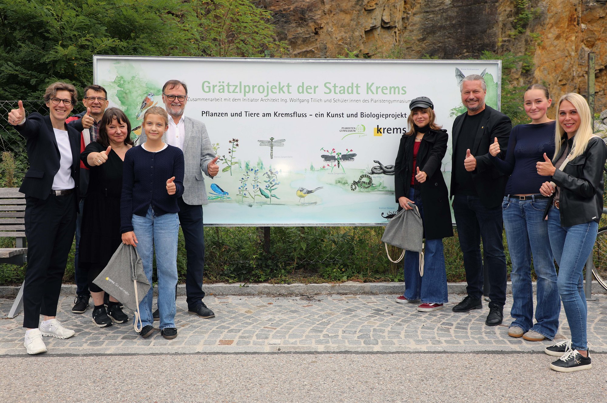 Für die Gestaltung der Schautafel konnte das Piaristengymnasium gewonnen werden. Vier Schulklassen (3GR, 6R, 7G1 und 7R) mit insgesamt rund 80 Schüler:innen arbeiteten im vergangenen Schuljahr im Biologie- bzw. Kunstunterricht an dem Projekt. 16 Schüler:innen lieferten eindrucksvolle Zeichnungen von Tieren und Pflanzen, aus denen Katharina Gartner von der Abteilung Stadtkommunikation, Marketing und Sales im Magistrat Krems die Grafik für die Schautafel entwickelte.