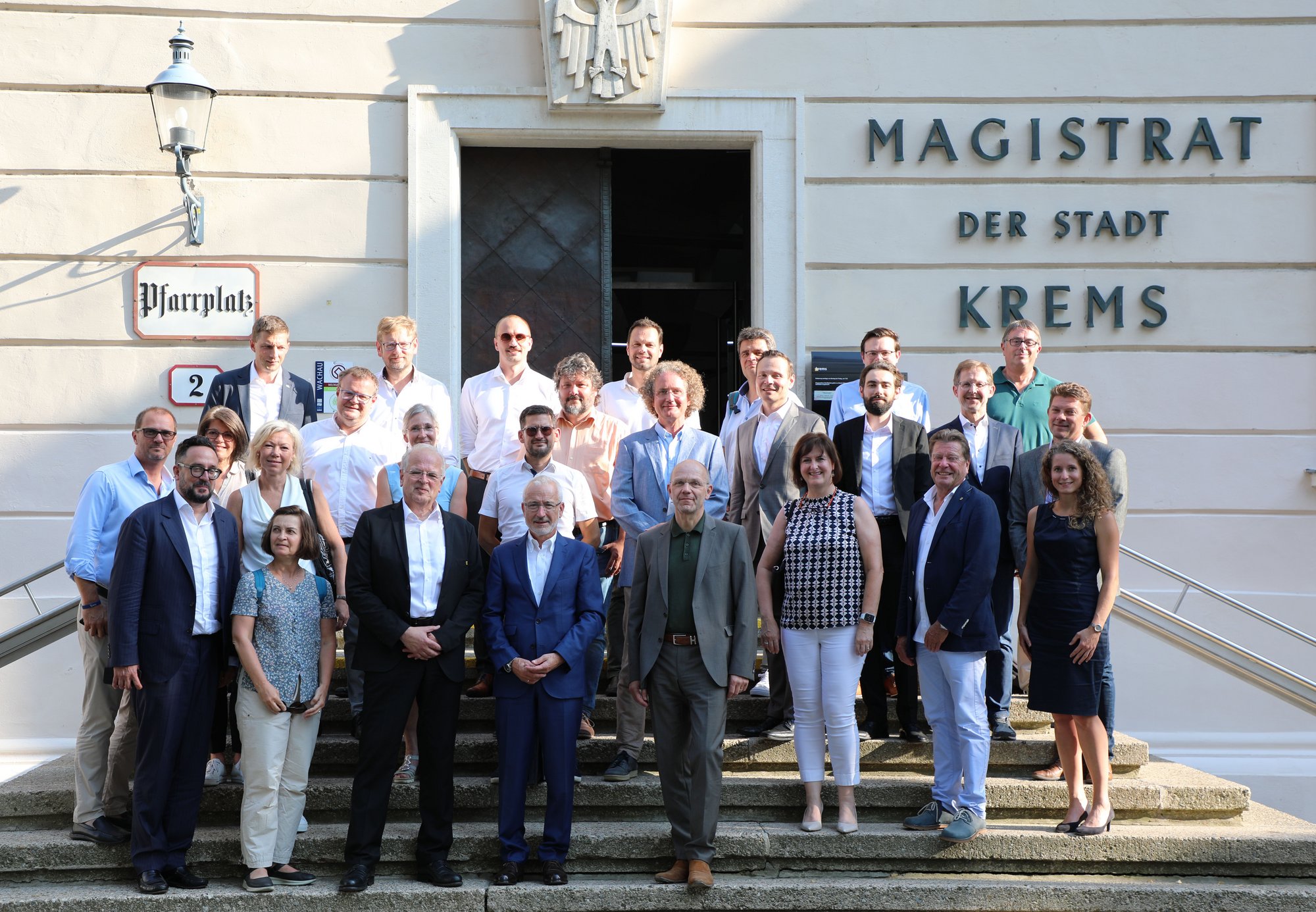 Foto 1: Vertreter*innen des Fachausschusses für Rechtsangelegenheiten und ab Mitte vorne von links: Bürgermeister Dr. Reinhard Resch, Magistratsdirektor Dr. Erich Hechtner (Wien), OSR Mag. Dr. Thomas Weninger MLS (Ö Städtebund), StR Helmut Mayer, Magistratsdirektor Mag. Hallbauer (Krems) und Dr. Johannes Schmid (Ö Städtebund)