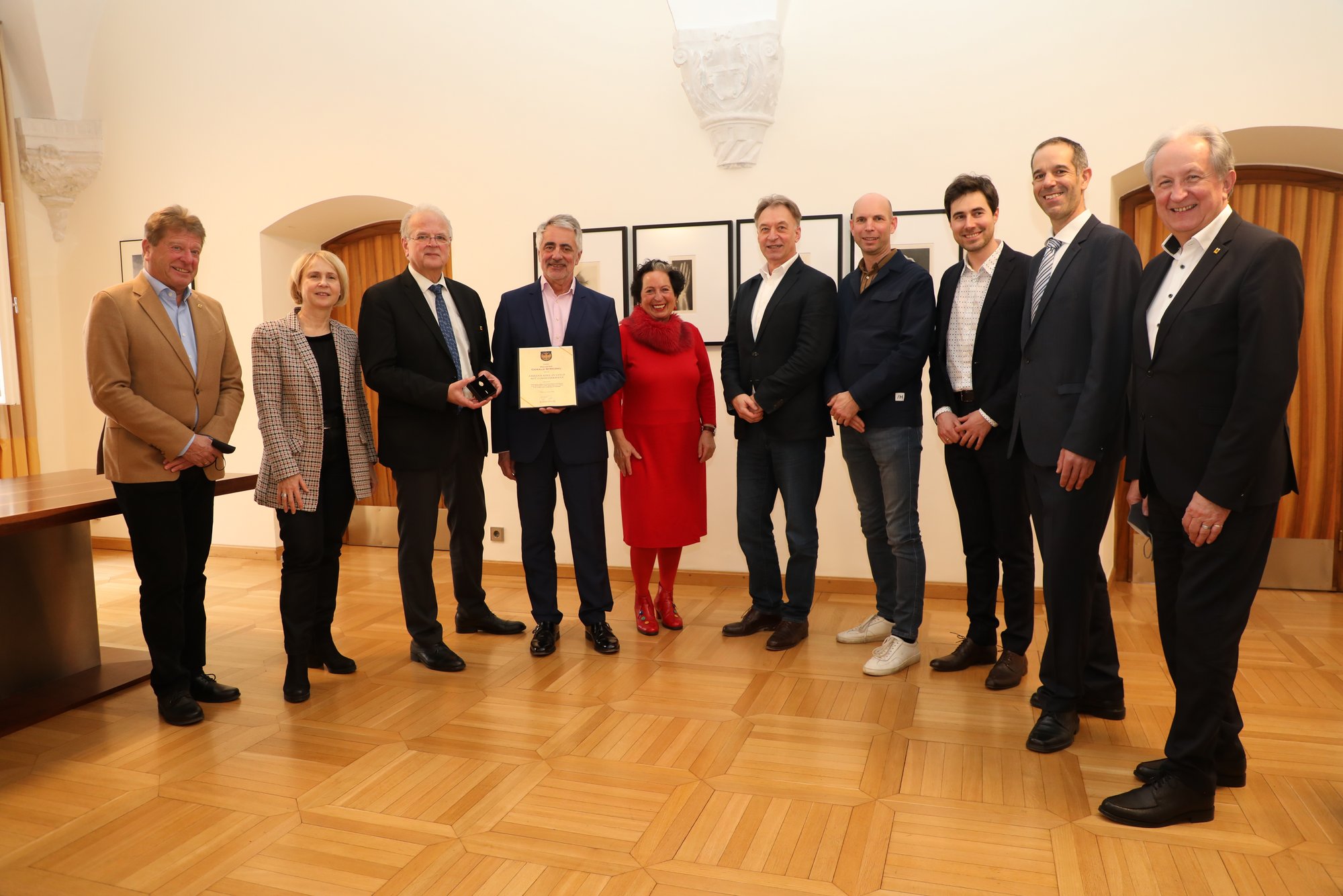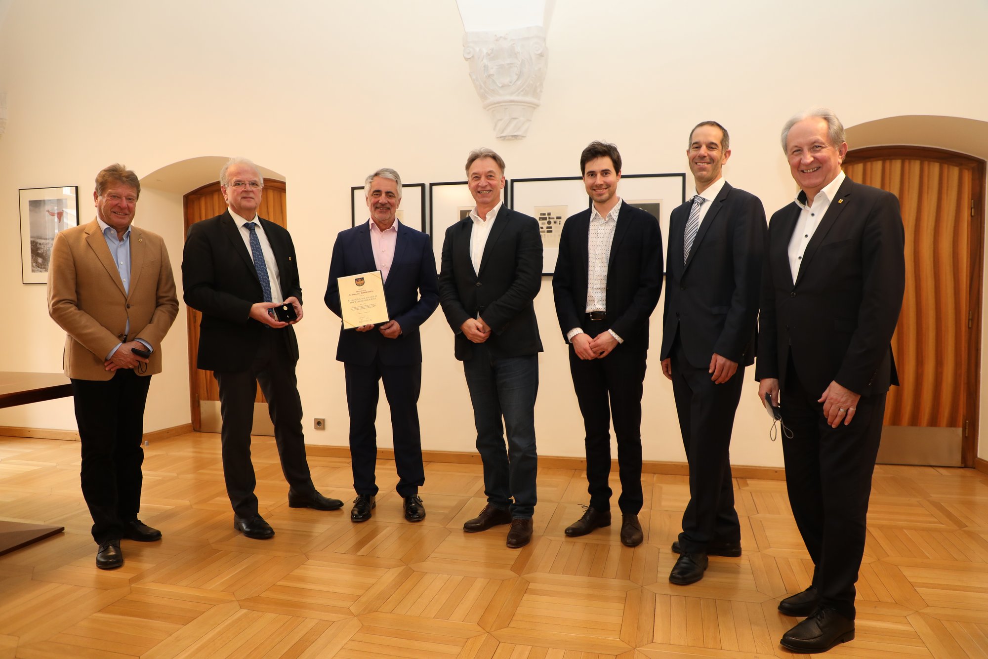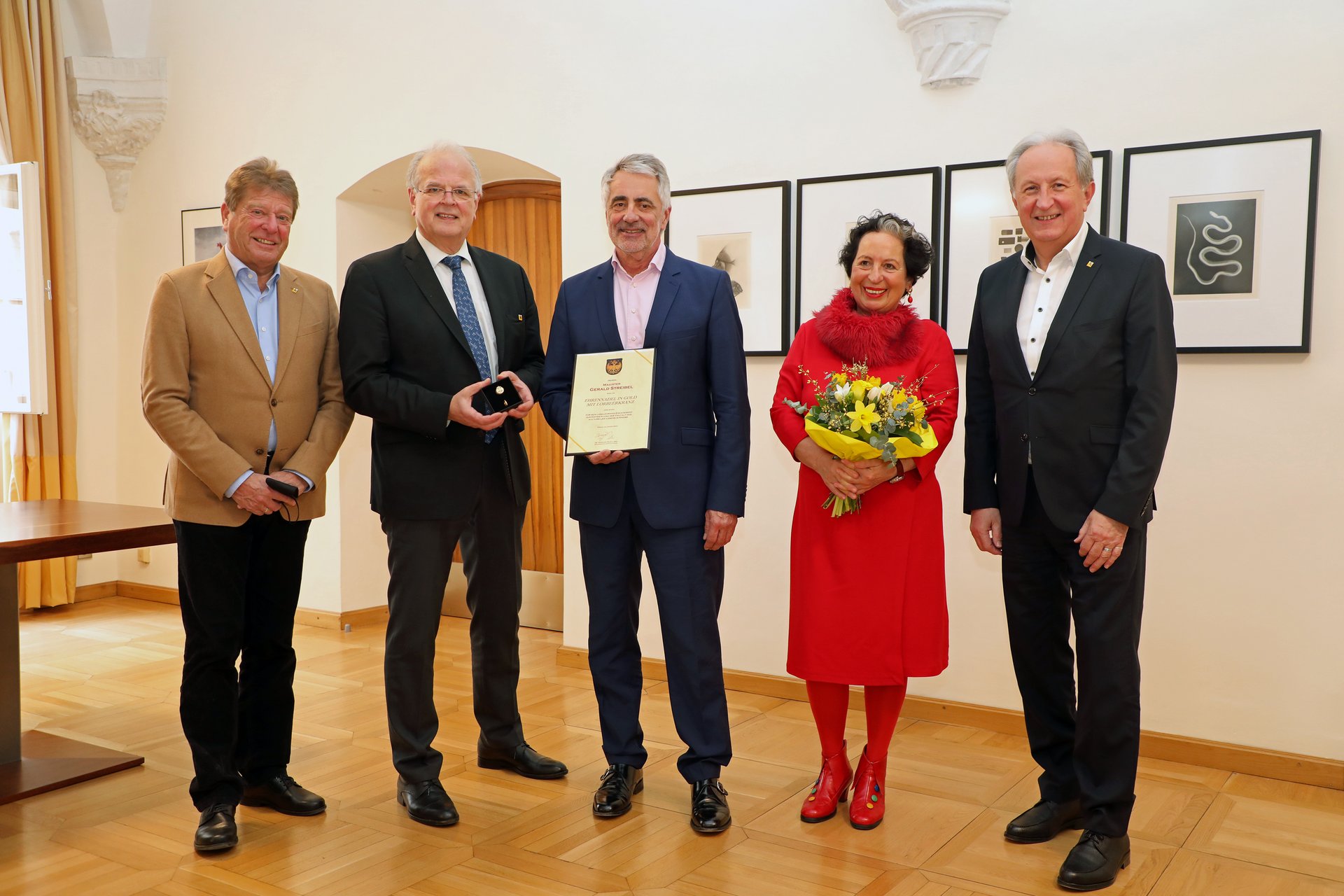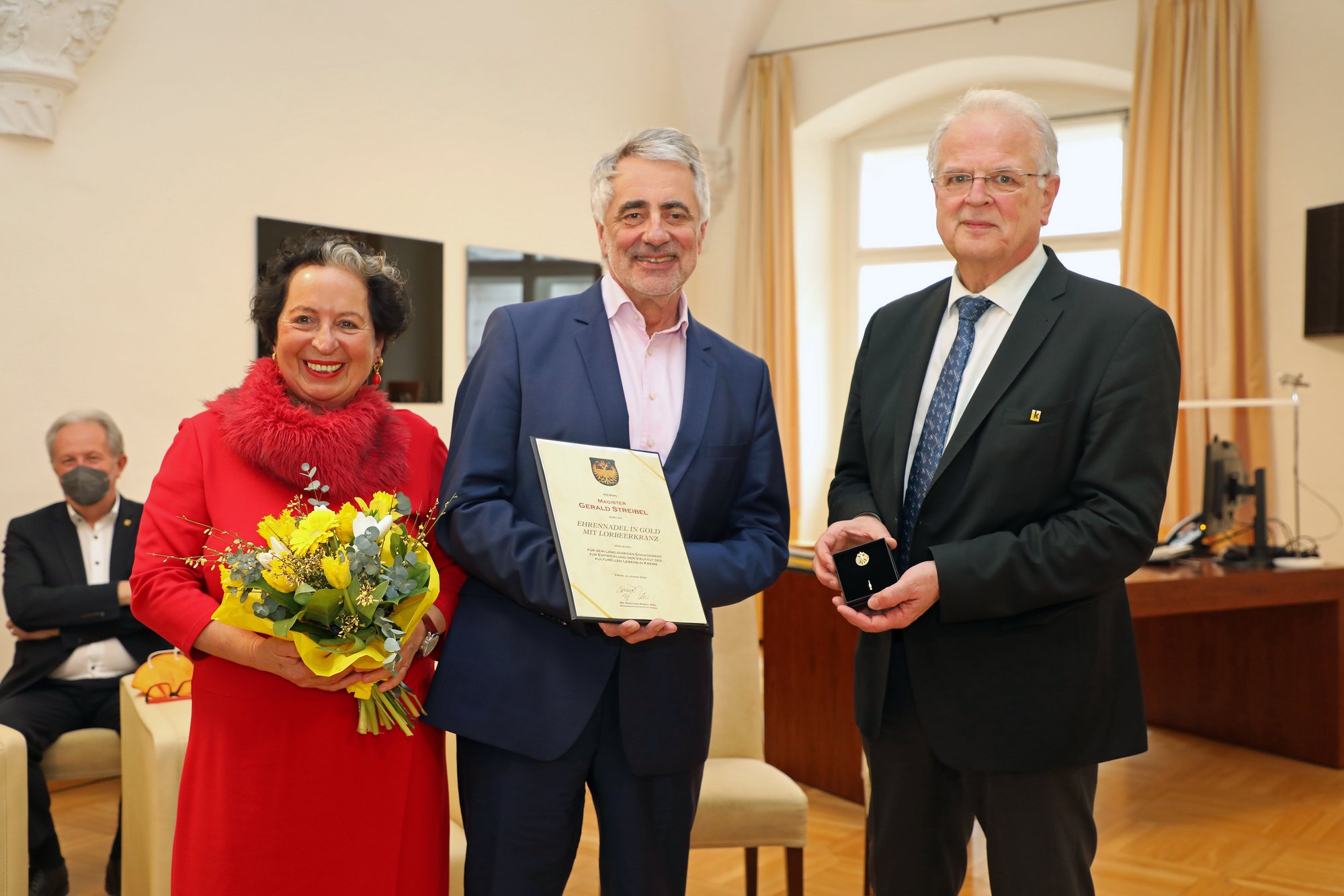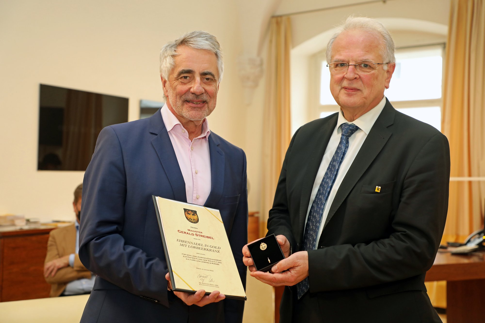 Bürgermeister Dr. Reinhard Resch verleiht Mag. Gerald Streibel die Ehrennadel in Gold mit Lorbeer.