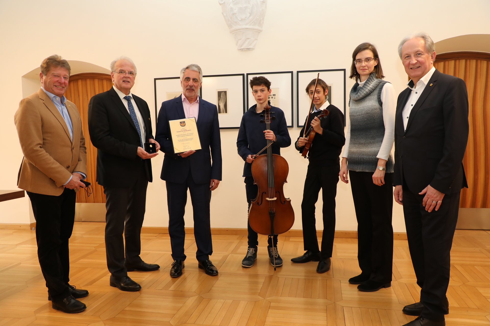 Der Geehrte mit Vertretern der Stadtpolitik und den jungen MusikerInnen: StR Helmut Mayer, Bgm. Dr. Reinhard Resch, Mag. Gerald Streibel, Maximilian Dorda, Arthur Heisler, Lydia Petzold und StR Günter Herz (von links).