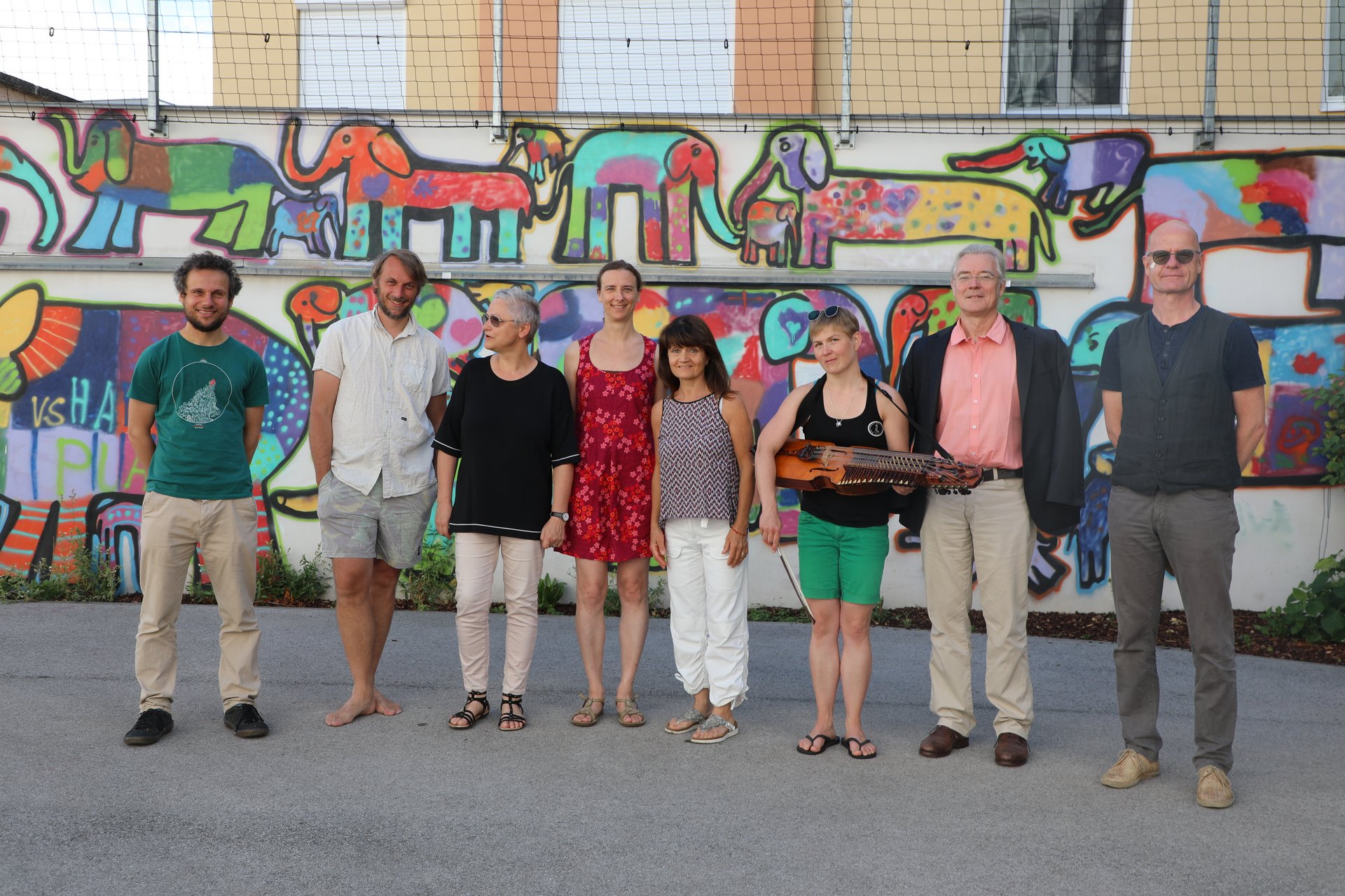 Foto: Musikschuldirektor Hubert Pöll begrüßt GlattVerkehrt-Festivalleiter Albert Hosp (ganz rechts), Musikwerkstattleiterin Evelyn Fink-Mennel (2.v.links) und die ReferentInnen Daniel Moser und Markus Prieth (beide Südtirol), Marinette Bonnert (Belgien), Luisa Cottifogli (Italien), Emilia Lajunen mit ihrer Nyckelharpe (Finnland) (von links).