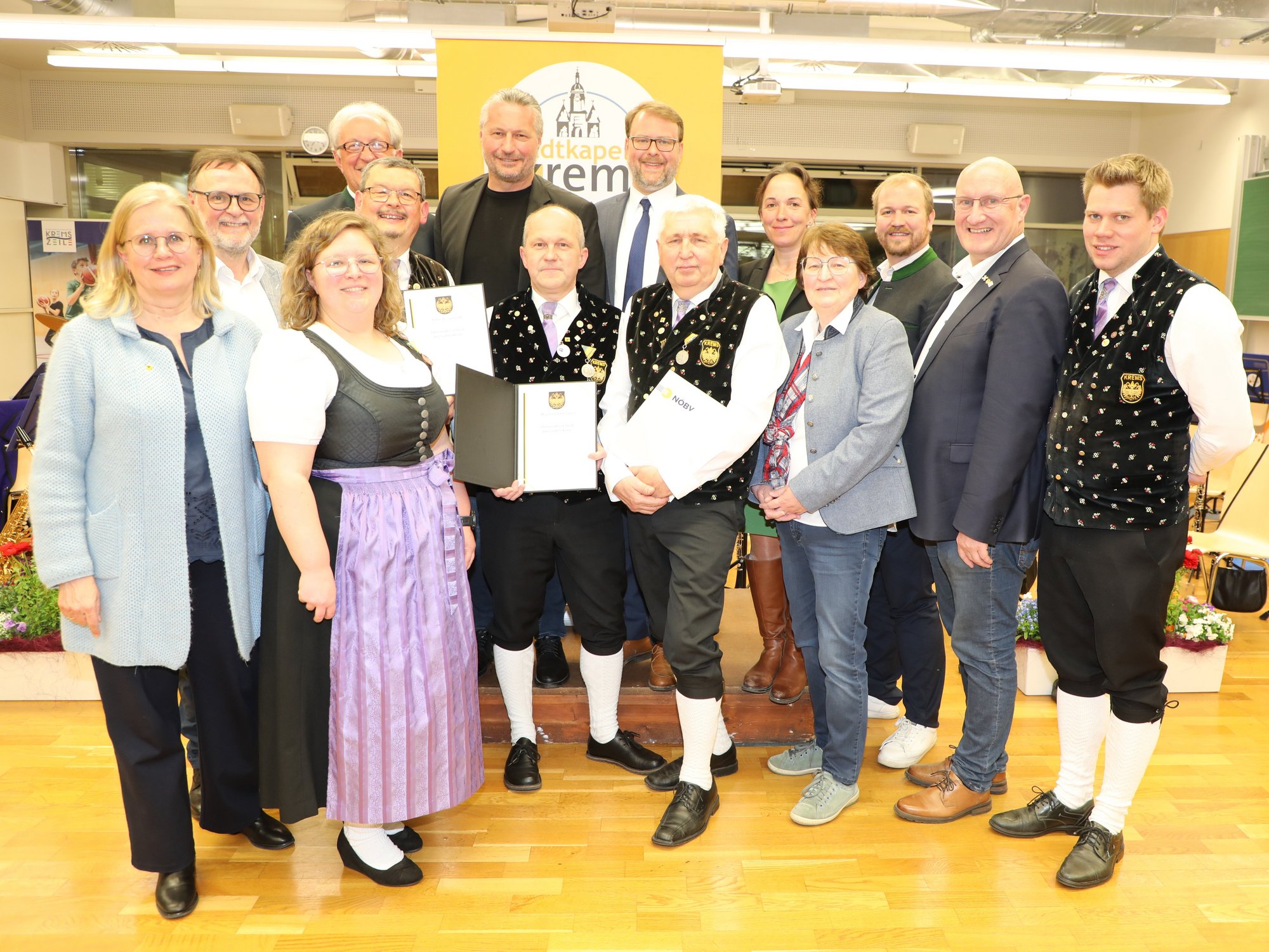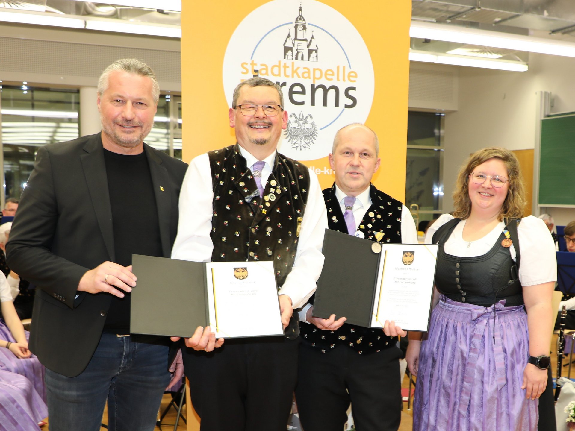 Auch die Stadtkapelle selbst nutzte den festlichen Rahmen, um langjährige und verdiente Mitglieder zu ehren. Obfrau Elisabeth Winkler zeichnete Andreas Rodinger für seine mehr als 15-jährige Tätigkeit im Vorstand aus. Helmut Beranek wurde für sein Engagement seit 1992 als Notenarchivar-Stellvertreter gewürdigt, während Hermine Böck für ihre seit 1985 andauernde Mitarbeit in unterschiedlichen Funktionen Anerkennung erhielt. Eine weitere Ehrung war für Josef Ettenauer vorgesehen, der dem Vorstand 19 Jahre lang als Kassier angehörte, diese jedoch krankheitsbedingt nicht persönlich entgegennehmen konnte. Auch seitens des Niederösterreichischen Blasmusikverbandes wurden Auszeichnungen vergeben: Bezirksobmann Martin Aschauer verlieh die Goldene Ehrenmedaille an Gerhard Schützenhofer sowie an Manfred Ettenauer.