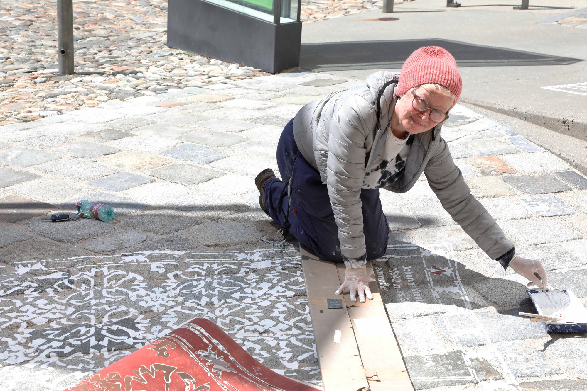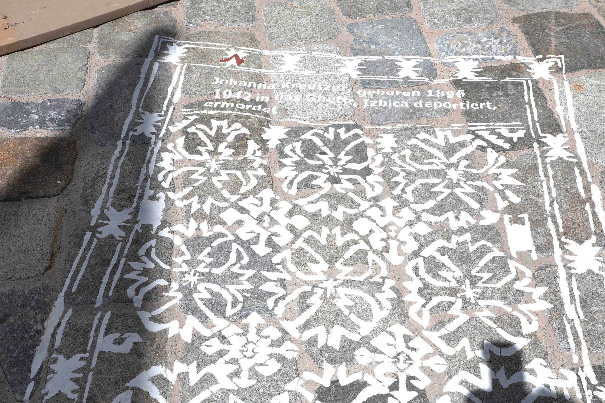 Weitgehend unbekannt sind die Biografien der Vertriebenen. Durch das Aufbringen von Farbe mit Hilfe handgefertigter Schablonen werden Teppiche angebracht, die den Frauen symbolisch ihren Platz in Krems zurückgeben. Sie entheben diese Frauen der Anonymität, benennen sie, stellen die Verbindung zur Geschichte her und geben ihnen zumindest für einen Zeitraum ihren Ort zurück - die symbolischen Teppiche sind Träger biografischer Informationen, von Namen und Tätigkeiten der Frauen. Die Farbe wird sich wieder je nach Witterung auflösen – damit wird der Kontext zur Vergänglichkeit aufgezeigt.
