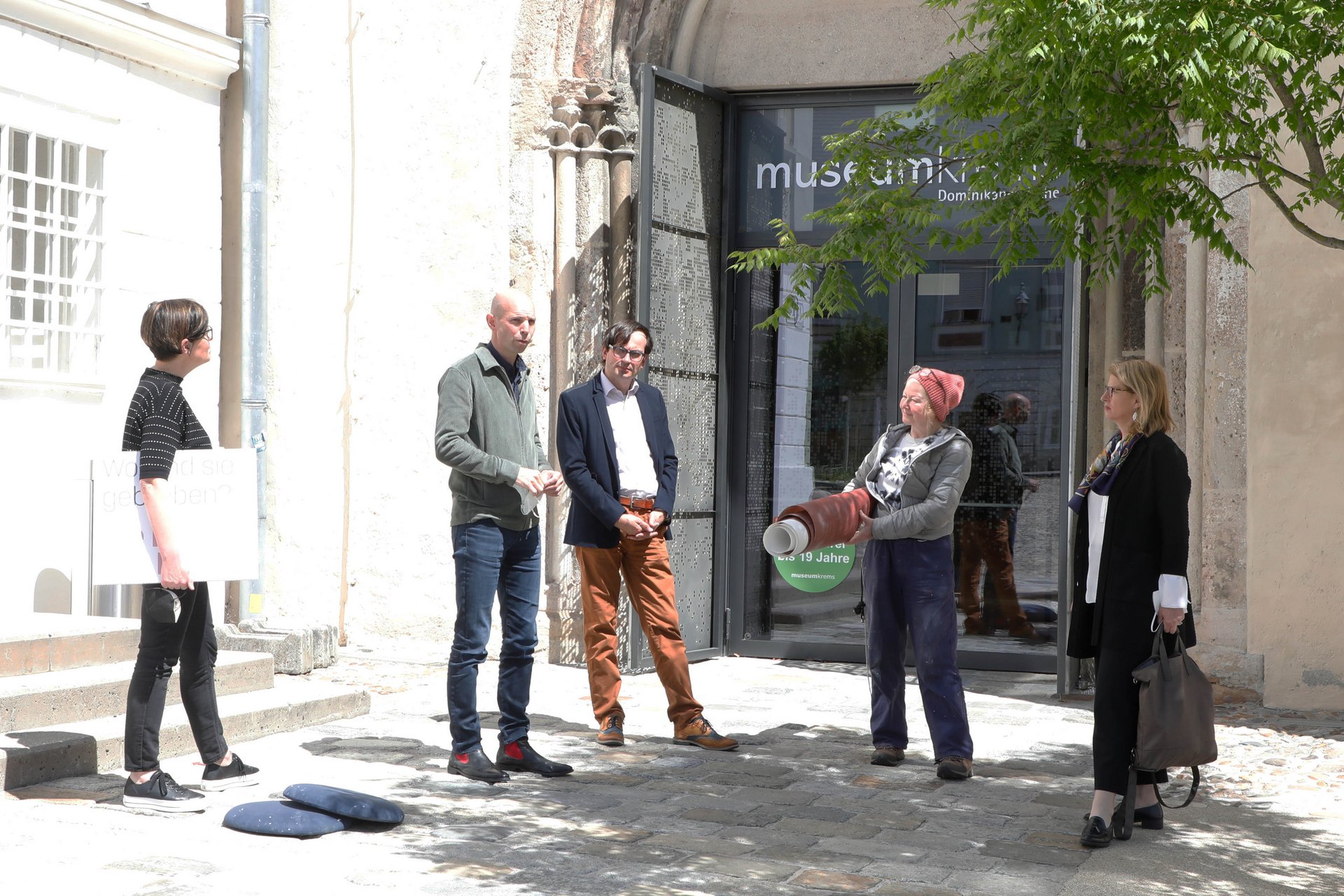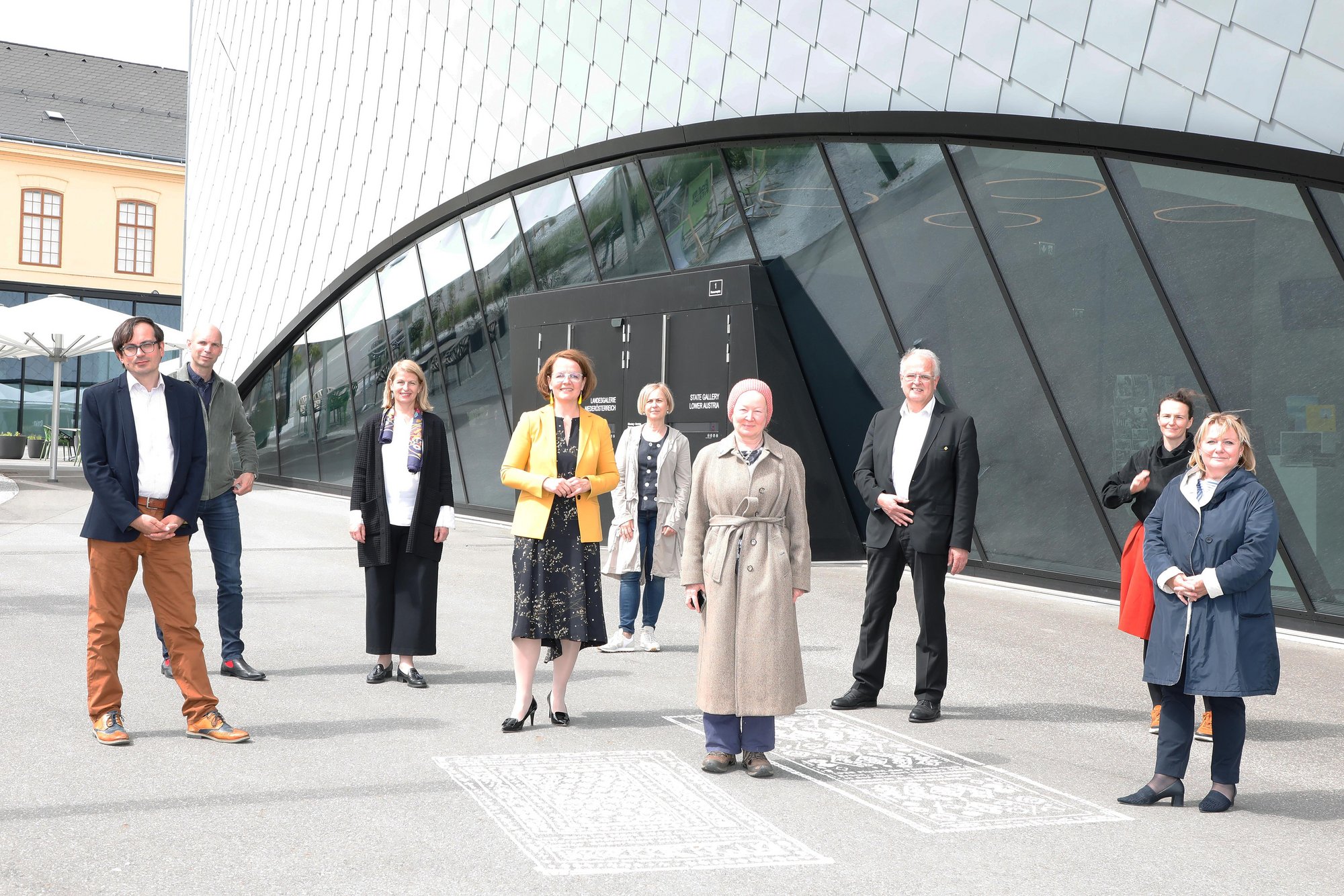 Foto: Eva Engelberger (Landesgalerie NÖ), Bgm. Reinhard Resch, Gabriele Ecker und Katarina Petter (Kulturabteilung Land NÖ), Landesrätin Christiane Teschl-Hofmeister, Günther Oberhollenzer (Landesgalerie), Iris Andraschek, Kulturamtsleiter Gregor Kremser, Kulturbereichsleiterin Doris Denk, museumkrems-Leiterin Sabine Laz (von links) eröffnen das Kunstprojekt im öffentlichen Raum.