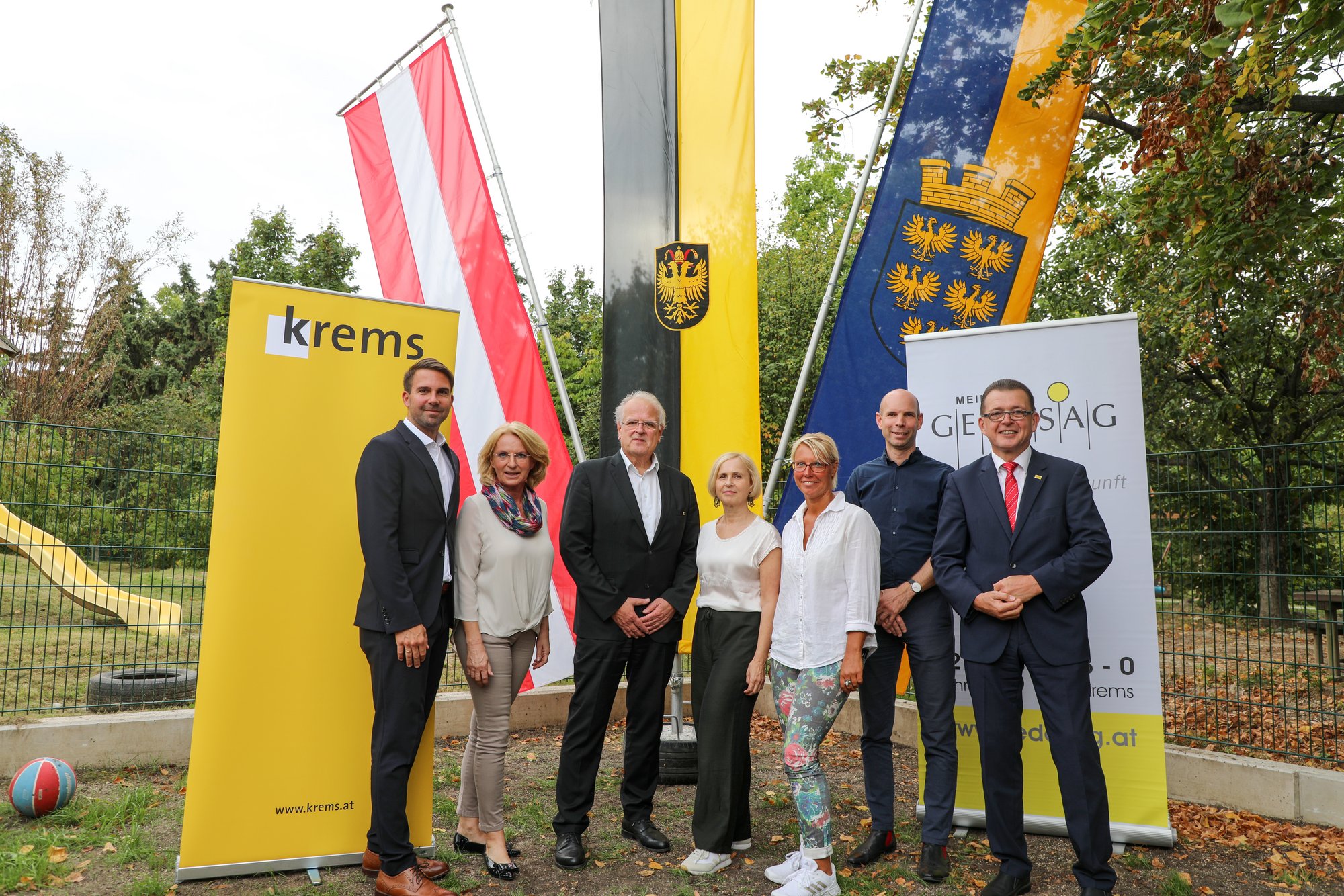 Foto: Jugendzentrum offiziell eröffnet: René Matous, Vizebürgermeisterin Eva Hollerer, Bürgermeister Dr. Reinhard Resch, Doris Denk, Manuela Leoni, Gregor Kremser und Othmar Amon (Vorstandsdirektor Gedesag), © Stadt Krems,