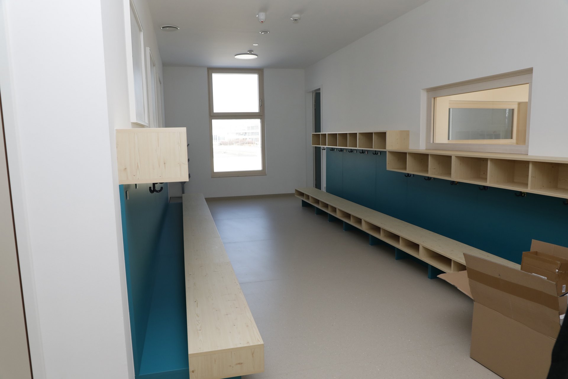 Die Chance, einen Kindergarten in nachhaltiger Bauweise in seiner Heimatstadt zu realisieren, bezeichnet er als „ganz besonderen Ansporn“. Seine Überlegungen zum Projekt: „Die Vorgaben des Architekturwettbewerbs waren klar: rasche Umsetzung und Nachhaltigkeit. In allen fünf Gruppen wurde mit gleichen Modulen, die bereits konstruktiv optimiert waren, gearbeitet.“ Damit sich die Kinder mit „ihrer“ Gruppe identifizieren können, schuf er mit seinem Team gestalterisch eigenständige Einheiten mit Wiedererkennungswert, wie zum Beispiel mit individuellen Garderoben und mit Details wie bestimmte Farben des Sonnenschutzes im Außenbereich. „Wichtig war auch der Wohlfühlfaktor. Deshalb haben wir auf ausreichend Platz, eine gute Belüftung und auf eine gute Orientierung im Gebäude geachtet“, so Wagensonner. Die zentrale Aula ist gleichzeitig Ankunftsort, Treffpunkt, Ruhezone und bietet Platz für Feste und Veranstaltungen.
