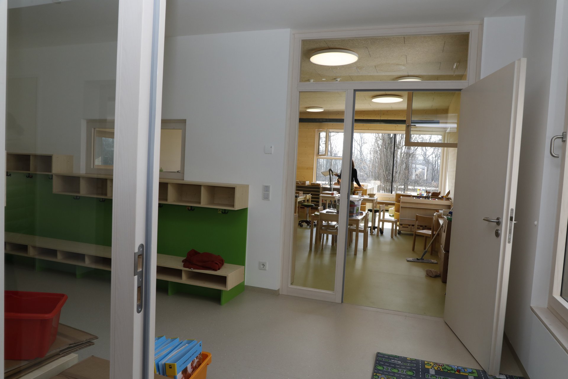 In Rekordzeit ist das neue Kindergartengebäude im Mitterauer Park entstanden. Nur acht Monate nach dem Spatenstich geht der Kindergarten kommenden Montag, 22. Februar, in Betrieb. Fünf Gruppen mit bis zu 125 Kindern bietet er Platz. Er ersetzt den Kindergarten Mitterau 2 in unmittelbarer Nähe sowie die Kleinkindergruppe Lilienfelderhof und ist um zwei weitere Gruppen erweitert worden. Das Gebäude fügt sich harmonisch in die Mitterauer Parkanlage. Geplant hat es Architekt DI Martin Wagensonner (Architekturbüro YES WE PLAN!). Sein Projekt war als Sieger aus einem Architekturwetttbewerb hervorgangen.