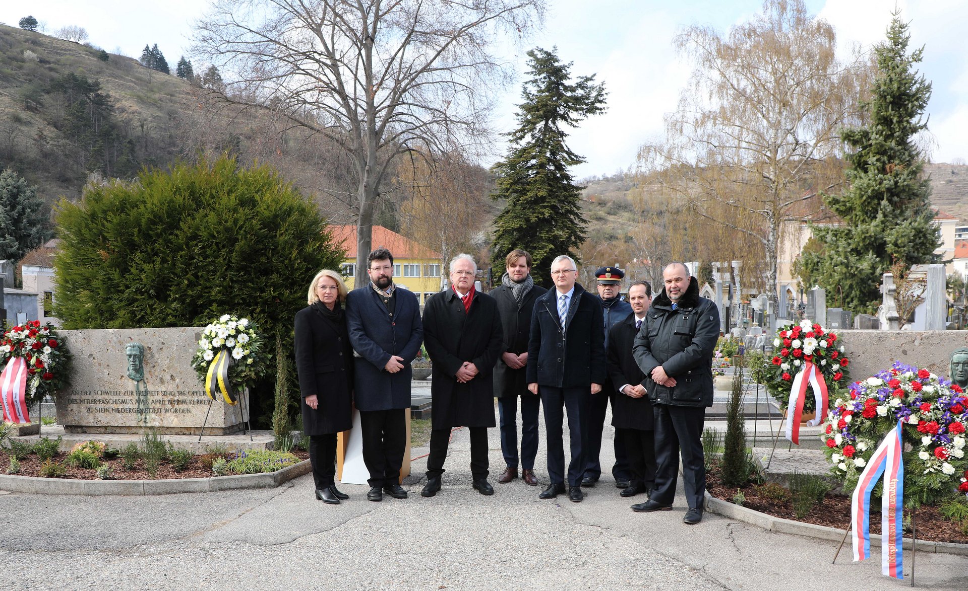 Foto 1: Vizebürgermeisterin Eva Hollerer, Harald Ludwig (Landesvorsitzender der Sozialdemokratischen Freiheitskämpfer NÖ), Bürgermeister Dr. Reinhard Resch, Mag. Daniel Stech (Botschaftssekretär Republik Tschechien), Bartłomiej Rosik (Generalkonsul Republik Polen), Oberst Roland Wanek (Justizanstalt Stein), Ioannis Mitzalis (Botschaftsrat der Republik Griechenland), Daniel Gluncic (S.E. der Botschaft von Republik Kroatien) bei der Kranzniederlegung am Steiner Friedhof (von links)