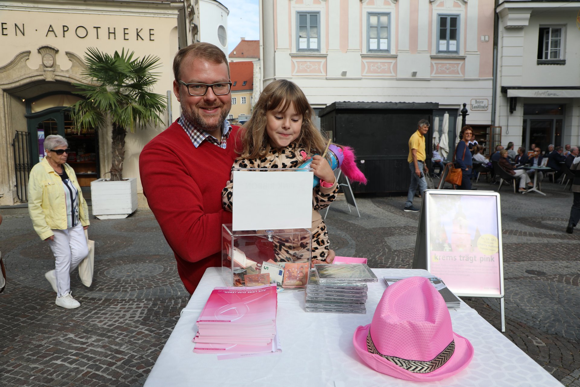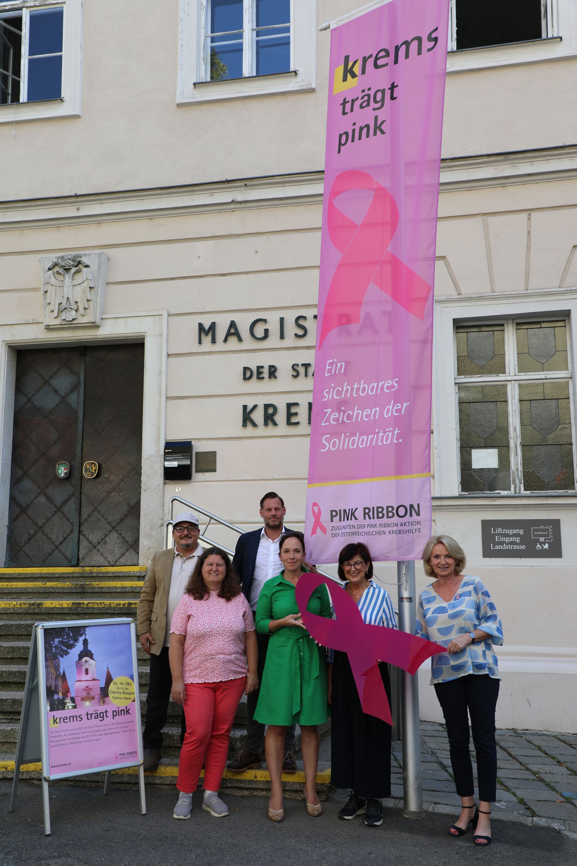 Auch heuer werden das Steiner Tor, der Stadtpark-Pavillon und die Gozzoburg das ganze Monat wieder in rosafarbenem Licht erstrahlen. Am Samstag, 14. Oktober, fiand eine Spendenaktion statt. In Zusammenarbeit mit dem Stadtmarketing Krems lud die Stadt zu einem Klavierkonzert mit Mag. Horst Berger und Musikerin Joanna CHEN am Täglichen Markt. Spendenboxen werden im Kremser Rathaus, in der Badearena, in der Stadtbücherei & Mediathek, im museumkrems und im Info-Center von kremstourismus aufgestellt. Als Dankeschön für eine Spende gibt es Infobroschüren, rosa Schleifen und CDs „Reise an den Ort der Ruhe und Achtsamkeit“.