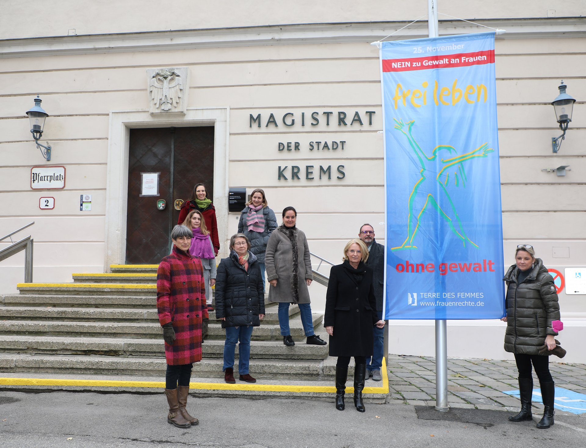 Vor dem Kremser Rathaus wird gemeinsam mit der Frauenberatung Lilith die Fahne „Frei leben ohne Gewalt“ gehisst. Bis 10. Dezember werden darüber hinaus das Steiner Tor, der Stadtpark-Pavillon, die Gozzoburg und die Dreifaltigkeitssäule in orangefarbenem Licht erstrahlen. „Unser Ziel ist es, Ausmaß und die unterschiedlichen Ausprägungen von Gewalt gegen Frauen zu thematisieren und Bewusstsein dafür zu schaffen“, sagt Vizebürgermeisterin Eva Hollerer.