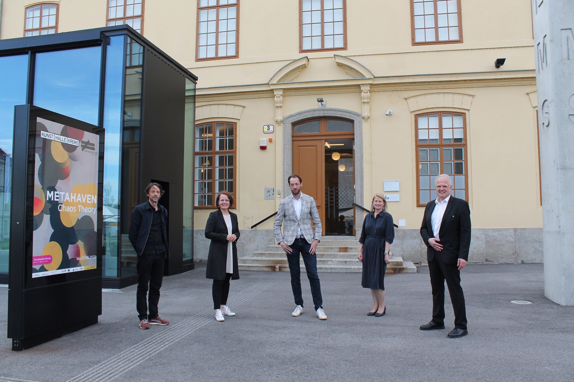 Foto: Thomas Edlinger (künstl. Leiter donaufestival), Landesrätin Christiane Teschl-Hofmeister, Florian Steininger (künstl. Direktor Kunsthalle Krems), Eva Engelberger (Geschäftsführerin Kunstmeile Krems) und Bürgermeister Reinhard Resch, (von links) © Kunstmeile Krems