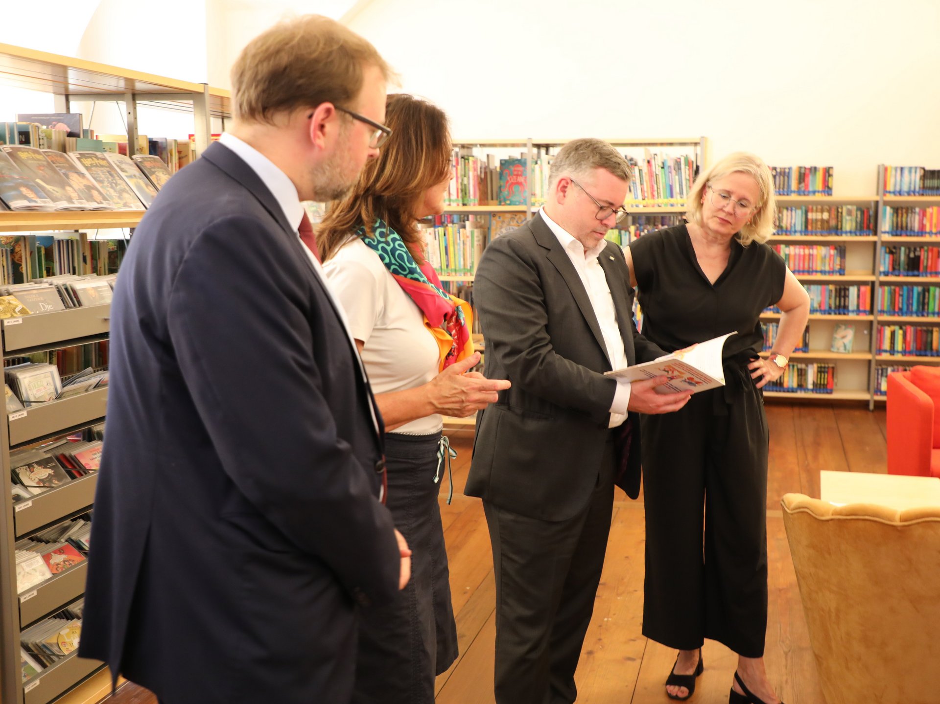 Seine Tour durch verschiedene niederösterreichische Bibliotheken führte Landesrat Ludwig Schleritzko auch in die Stadtbücherei Krems. Der Landespolitiker zeigte sich beeindruckt von den modernen ausgestatten Räumlichkeiten, die einst schon die Bibliothek des Dominikanerklosters beherbergten. Büchereileiterin Kathrin Raffetseder und Magistrats-Bereichsleiterin Doris Denk stellten dem Landespolitiker das umfangreiche Angebot der Bücherei vor und verwiesen dabei auch auf diverse Veranstaltungen wie regelmäßige Lesungen oder die Vorlesezeit im Sommerbad (jeden Freitag im Juli und August von 14.30 bis 16 Uhr). Schleritzko erkundete außerdem den neuen und vielseitig nutzbaren Jugendraum, den die Stadtbücherei erst heuer im April eröffnet hat. Bei seinem Rundgang begleitet wurde der Landesrat von Vizebürgermeister Florian Kamleitner, Stadtrat Helmut Mayer, der Kulturbeauftragten des Bürgermeisters, Gemeinderätin Elisabeth Kreuzhuber, und der Geschäftsführerin von Treffpunkt Bibliothek, Ursula Liebmann.