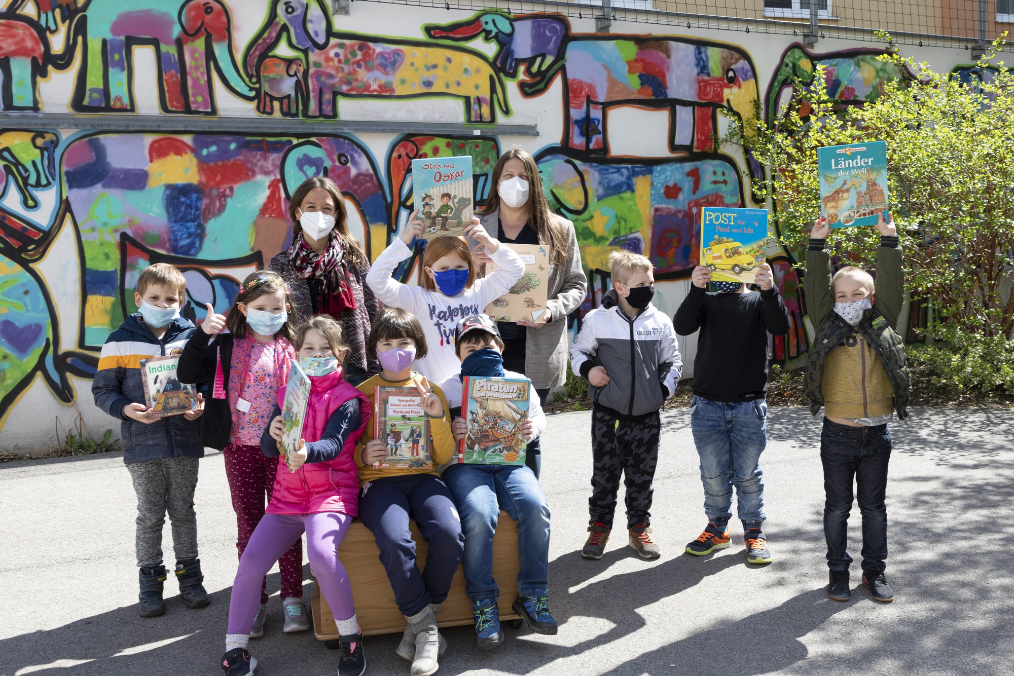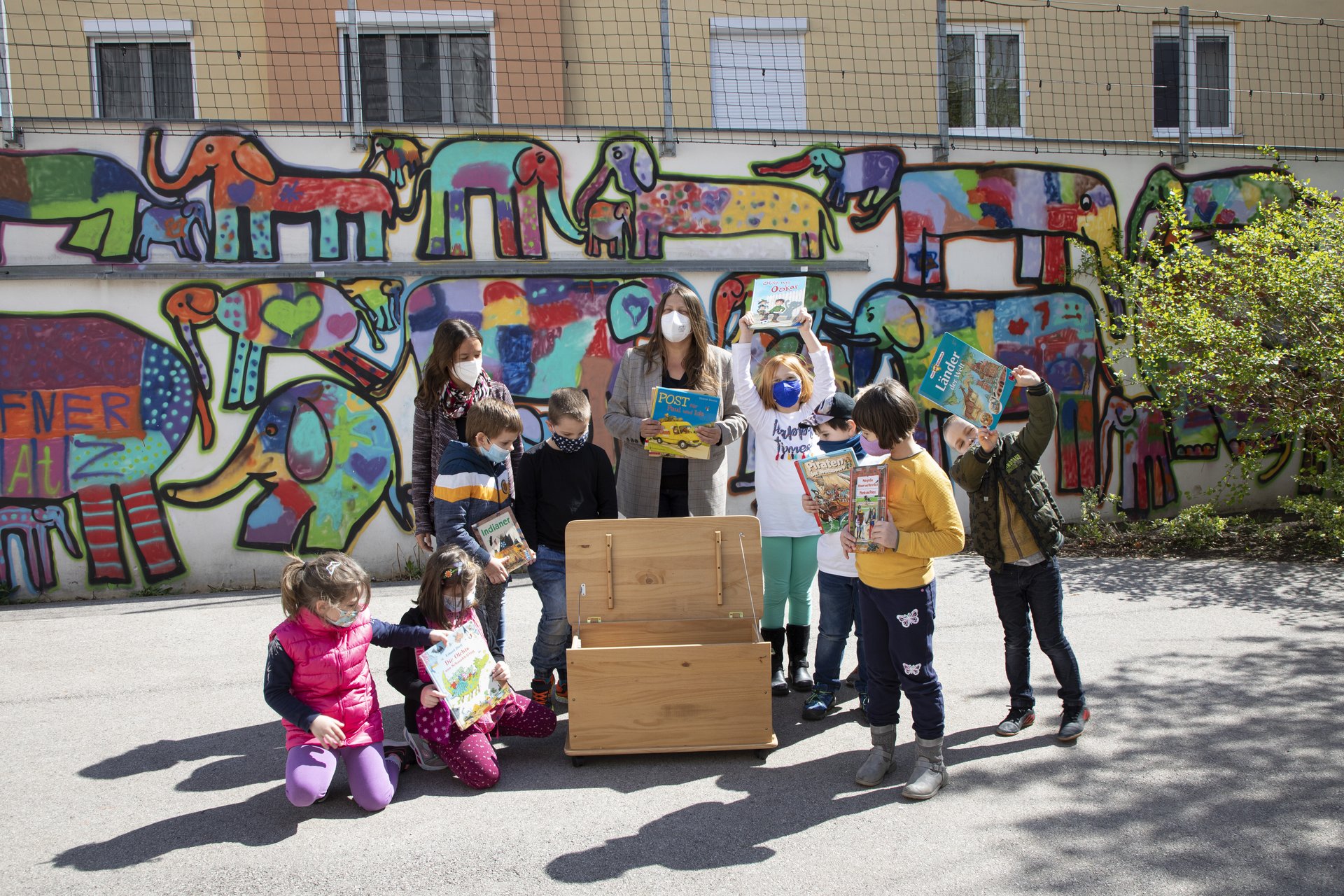 Foto: Eine Bücherkiste ist eine Schatzkiste für lesehungrige Kids. Claudia Skopal hat eine neue Bücherkiste in die Volksschule Hafnerplatz geliefert, und die Kinder der Vorschulklasse mit Pädagogin Anna Sajovic haben die Schätze sofort gehoben © Stadt Krems, Abdruck bei Namensnennung honorarfrei.