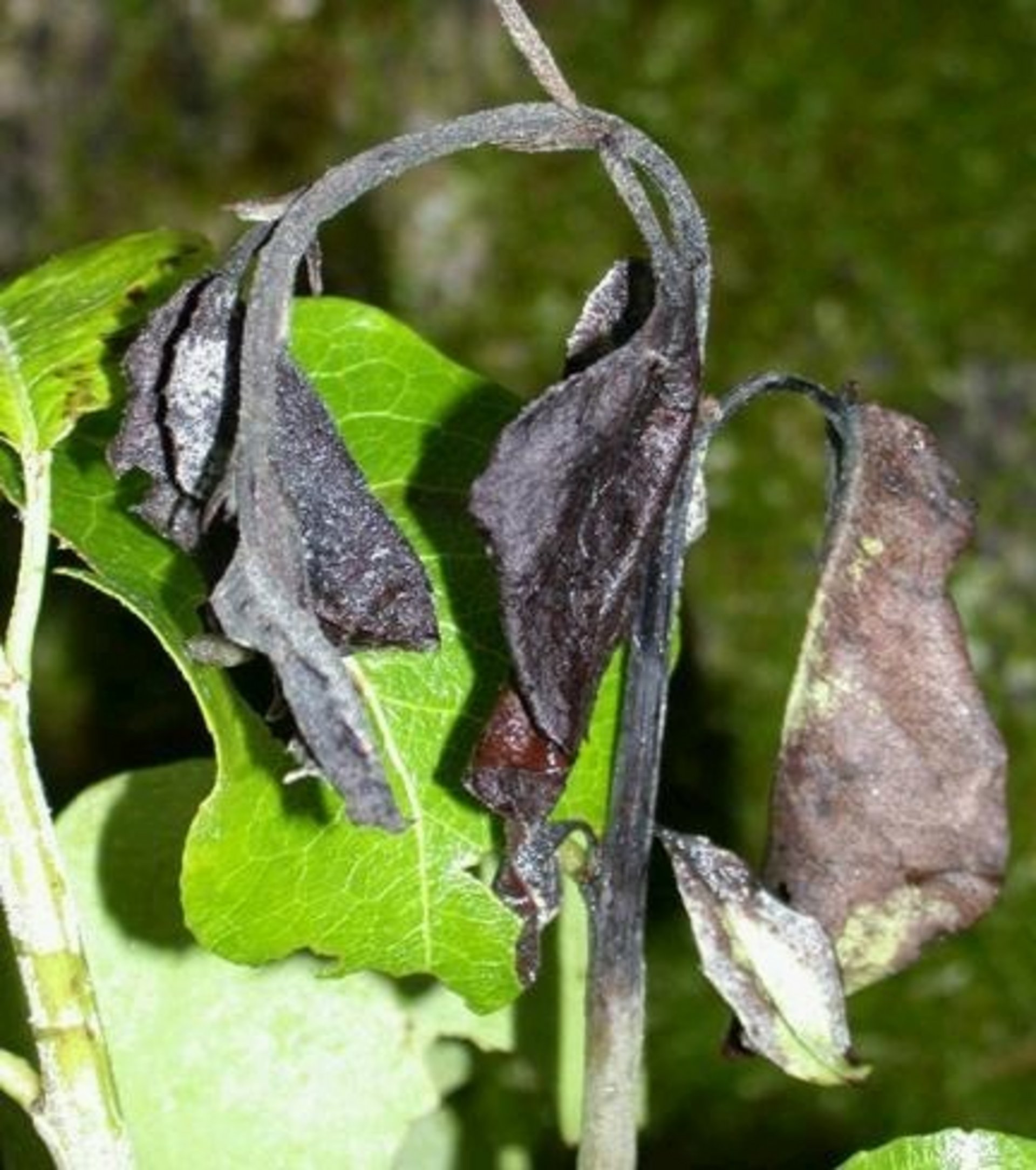Symptome: Welke Blüten, Triebe und Früchte, hakenförmige Triebspitzen, braune bis schwarze Blätter. Bei feuchter Witterung können klebrige, gelbbraune Tropfen auftreten.