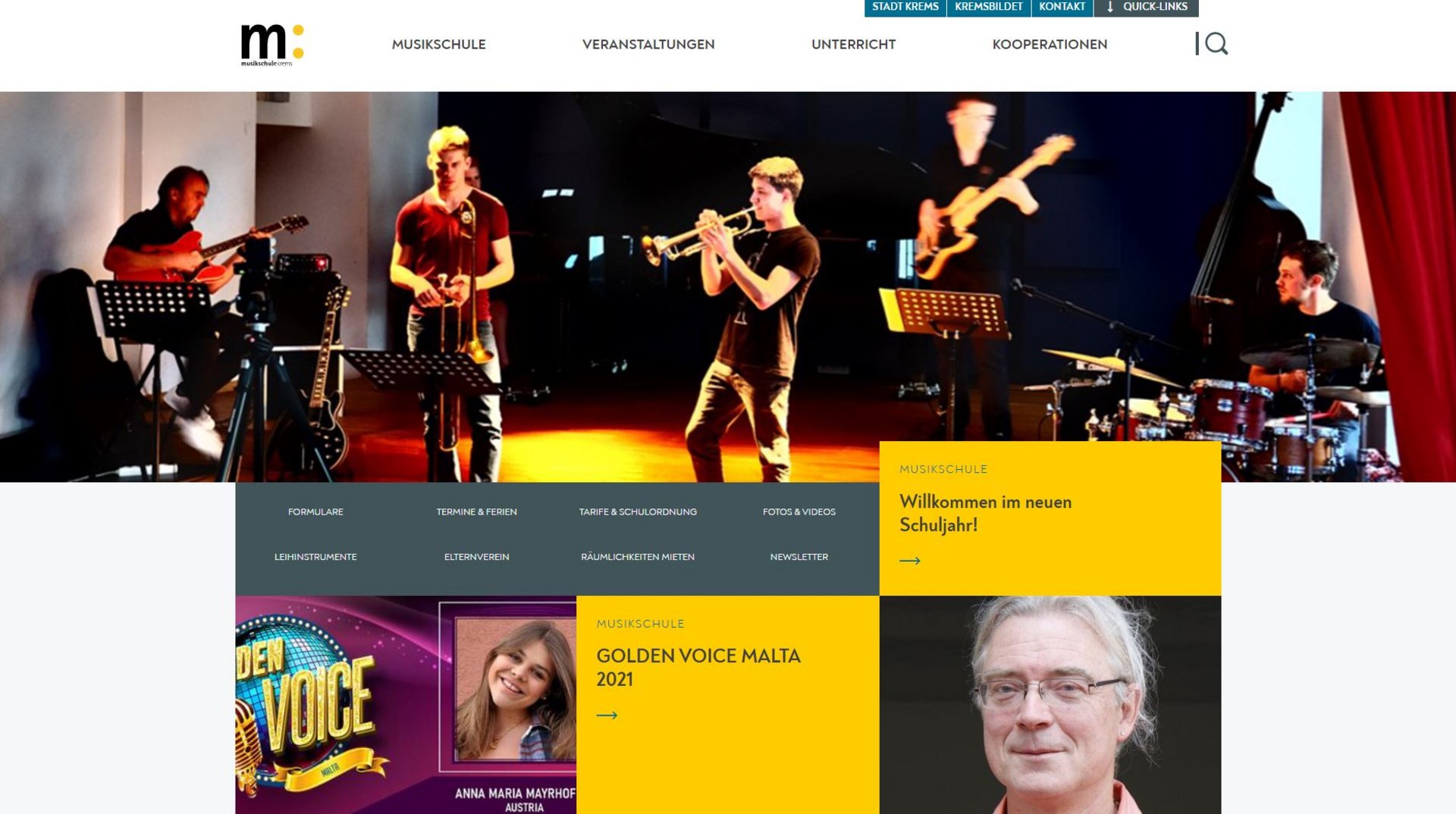 Neben responsiv Design, das heißt, dass sich die Website an Handy und Tablet anpasst, und barrierefreier Ausführung punktet die Seite mit einer optimierten Suchfunktion und einfacher Strukturierung. Unterstützend verweisen prominent platzierte Quicklinks auf häufig gesuchte Menüpunkte wie Anmelde-Formulare, Termine, Tarife und Schulordnung. www.krems.at/musikschule