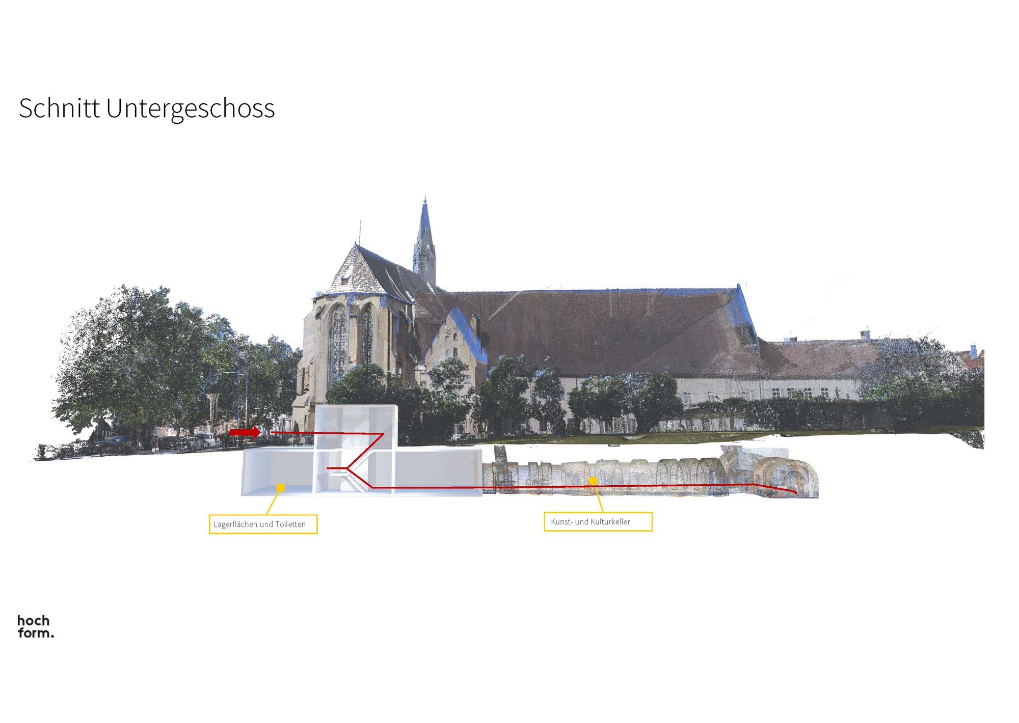 Im Erdgeschoss des Klosters sollen Garderoben, Cateringbereich und ein weiterer Lift untergebracht werden, mit dem das Gebäude barrierefrei zugänglich wird. In den ebenfalls in diesem Bereich situierten unterirdischen „Senfkeller“ des Museums könnte der Jazzkeller bzw. Kunst- und Kulturkeller seinen Platz finden und künftig für Konzerte, Theateraufführungen oder Lesungen genutzt werden. Der derzeitige Jazzkeller auf der Westseite des Areals, der immer wieder für Lärmbeschwerden der Anrainer:innen sorgte, soll hingegen dauerhaft geschlossen bleiben. Für die gastronomische Bewirtung wird ein Catering-Konzept empfohlen.