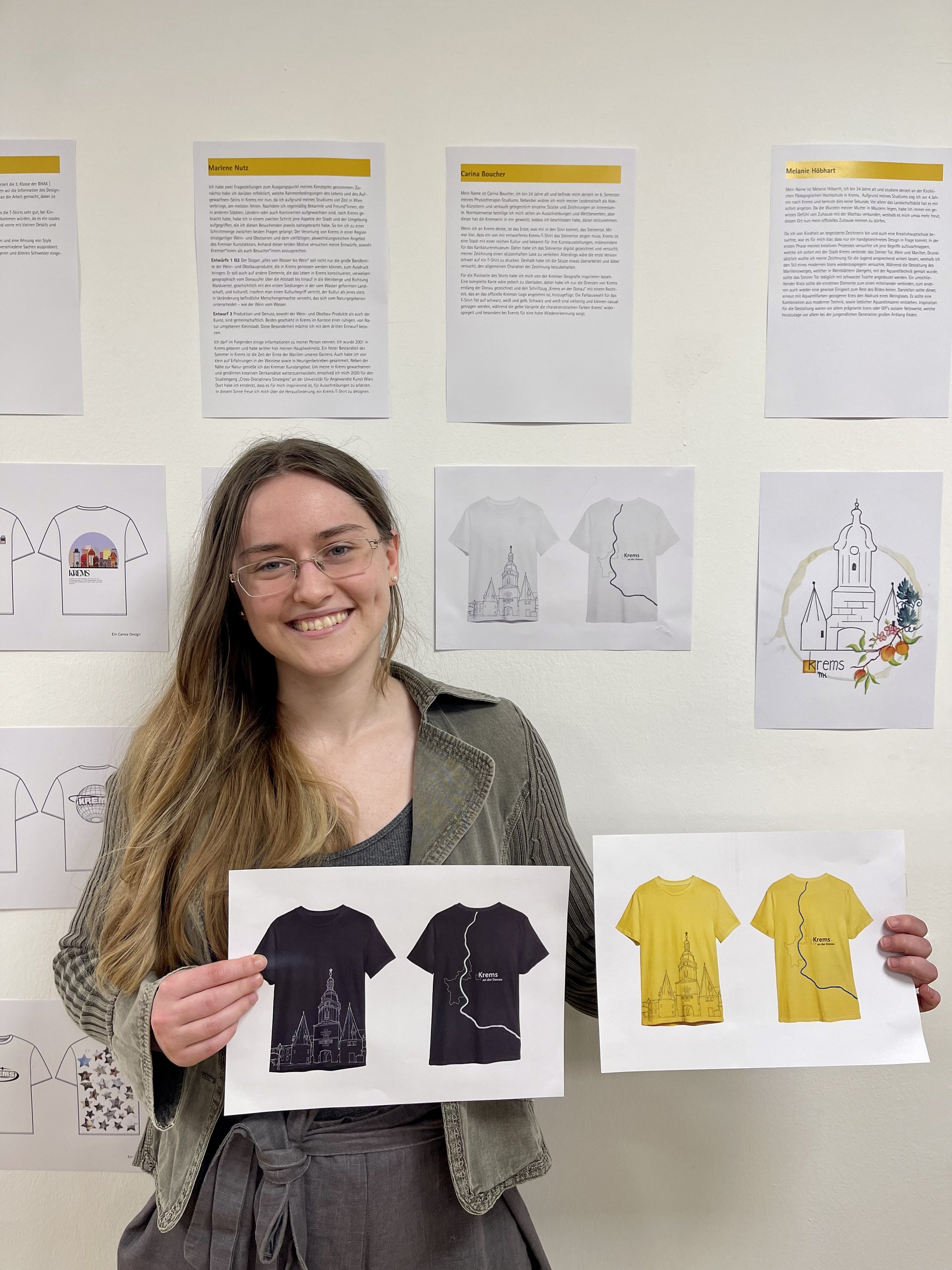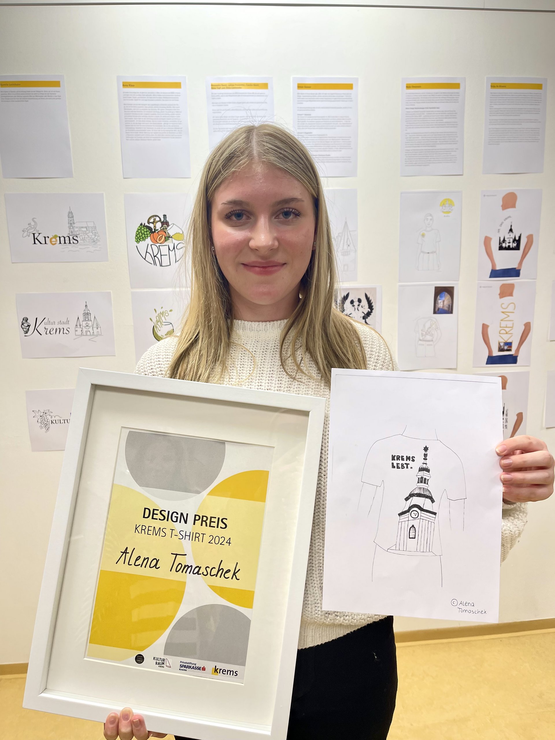 Gewinnerin Alena Tomaschek ist 15 Jahre alt, kommt aus Vitis und besucht die Kremser Modeschule (HLM Krems). Über ihre Idee sagt sie: „Als ich das erste Mal in der Innenstadt war, faszinierte mich das Steiner Tor am meisten. Heute gehe ich jeden Tag durch, deshalb verbinde ich Krems mit dem Steiner Tor. Krems lebt habe ich auf mein T-Shirt geschrieben, weil ich finde, dass Krems sehr belebt ist. Es ist immer etwas los.“