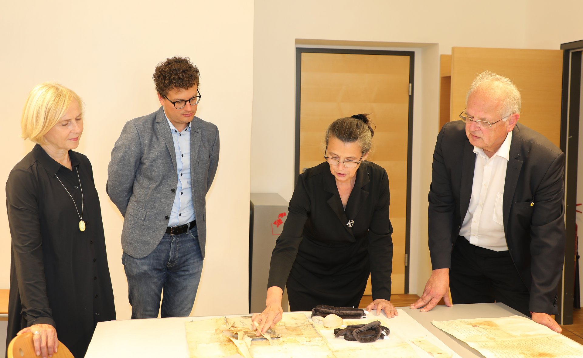 Foto: Doris Denk, BA (Bereichsleiterin Bildung, Kultur und Tourismus), Bürgermeister Dr. Reinhard Resch, MSc, Dr.in Patricia Engel, Daniel Haberler-Maier, MA (Stadtarchiv) (von links)