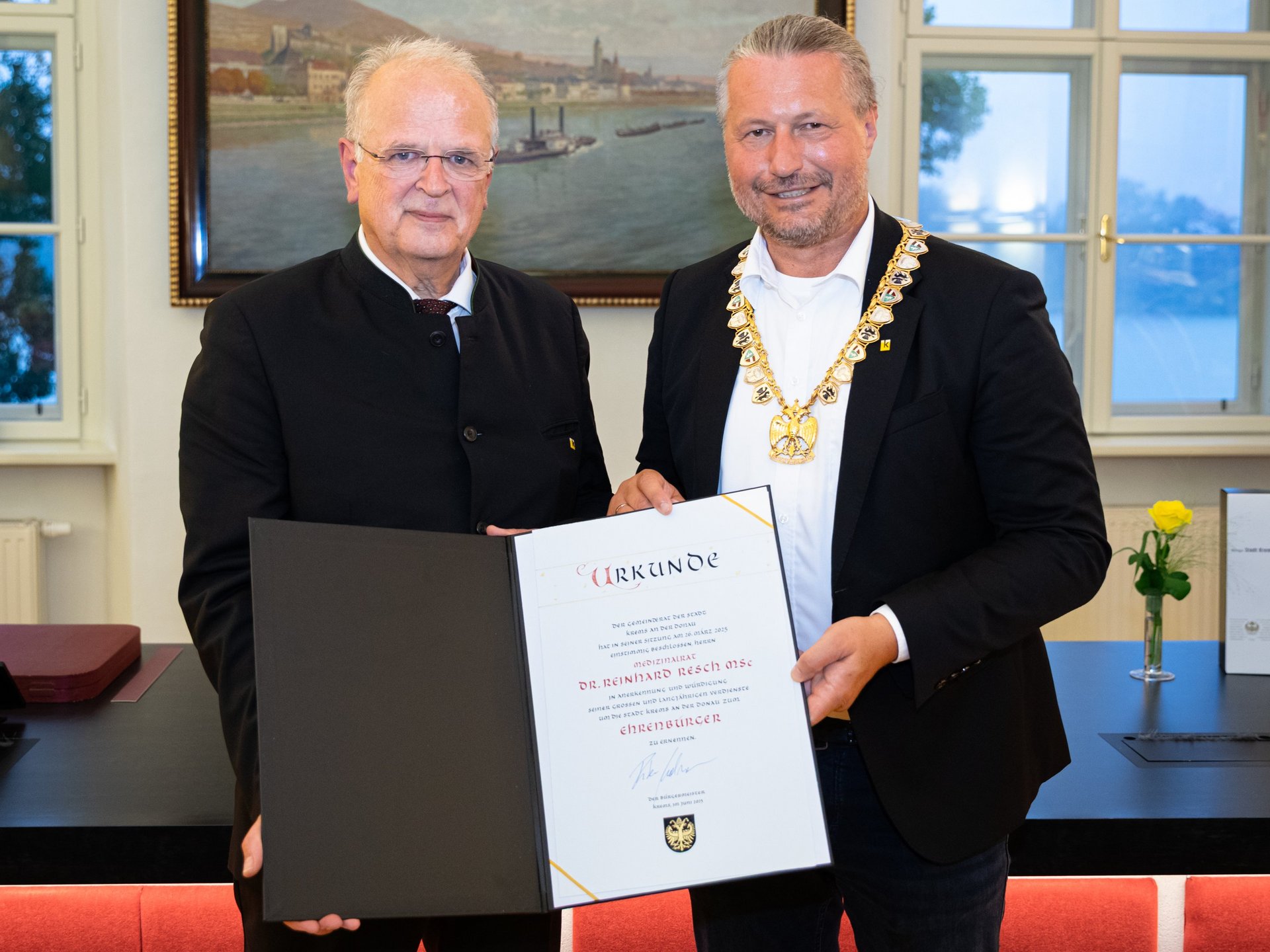 Im März 2025 hatte der Gemeinderat der Stadt Krems einstimmig beschlossen, den früheren Bürgermeister Reinhard Resch zum Ehrenbürger zu ernennen. „Es gibt nur ganz, ganz wenige Persönlichkeiten, die diese Auszeichnung so verdient haben, wie Reinhard Resch“, würdigte Bürgermeister Peter Molnar die außergewöhnlichen Leistungen und Verdienste seines Vorgängers und überreichte ihm die Ehrenbürgerurkunde. Der Festakt fand im Rathaus Stein statt – jener Ort, an dem Reinhard Resch weit über 100 Gemeinderatssitzungen geleitet hatte. „Die Beschlüsse, die hier unter Deiner Ägide gefasst wurden, wirken bis heute. Sie haben Krems zu einer modernen, weltoffenen und zukunftsfähigen Stadt gemacht“, unterstrich Kulturgemeinderätin Elisabeth Kreuzhuber in ihrer Begrüßung.