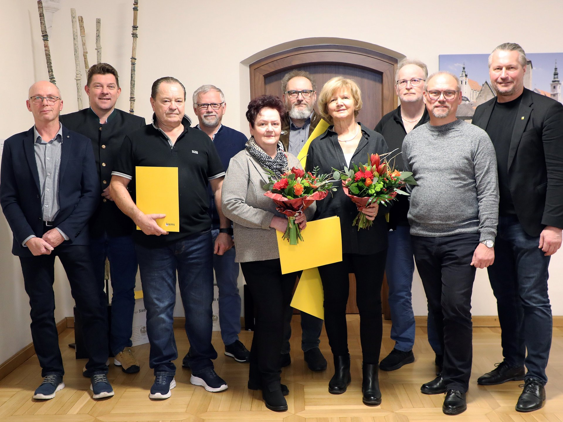 Mit stolzen 45 Dienstjahren zählt Hermann Ettenauer zu den dienstältesten Mitarbeiter:innen im Magistrat. Nach seiner Lehre als Wasserleitungsinstallateur begann er 1981 im Wasserwerk, wechselte 1985 ins Klinikum und blieb dort bis zu seinem Pensionsantritt. Nach 37 Dienstjahren trat Gerlinde Rehberger heuer in den Ruhestand. Sie begann 1988 in der Abteilungsadministration des damaligen städtischen Krankenhauses, wechselte später ins Bürgermeisterbüro und in die KFZ-Abteilung. Von 2014 bis zu ihrer Pensionierung war sie im Strafamt tätig. Mit Jahresende verabschiedet sich Ewald Hagmann nach 35 Dienstjahren vom Magistrat Krems. Seit 1990 war er im Wirtschaftshof tätig und absolvierte 2003 den Straßenwärterlehrgang.