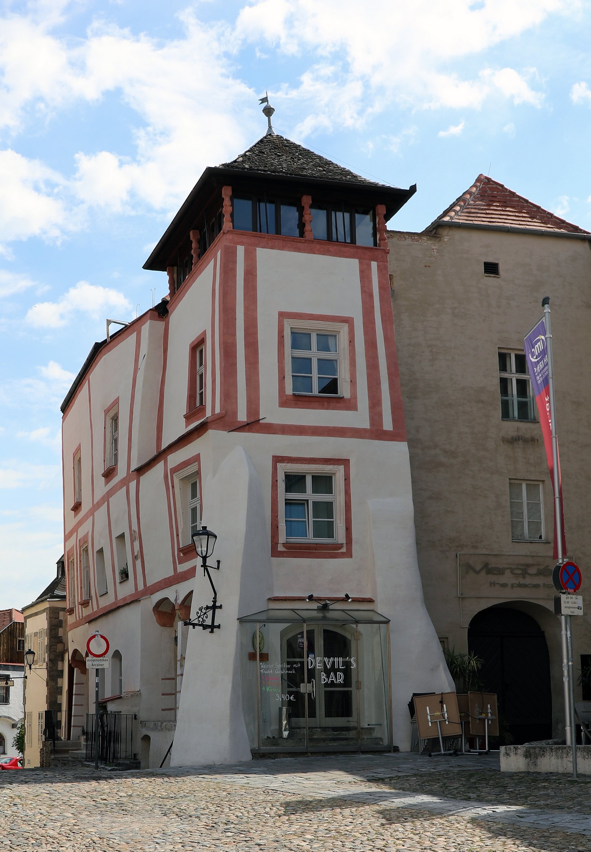 Hoher Markt 10 (2022): Der Baukern in unmittelbarer Nachbarschaft zur Gozzoburg stammt aus dem 14. und 15. Jahrhundert. Ein Eckturm flankiert den dreigeschossigen Bau mit unregelmäßiger Fensterstellung.