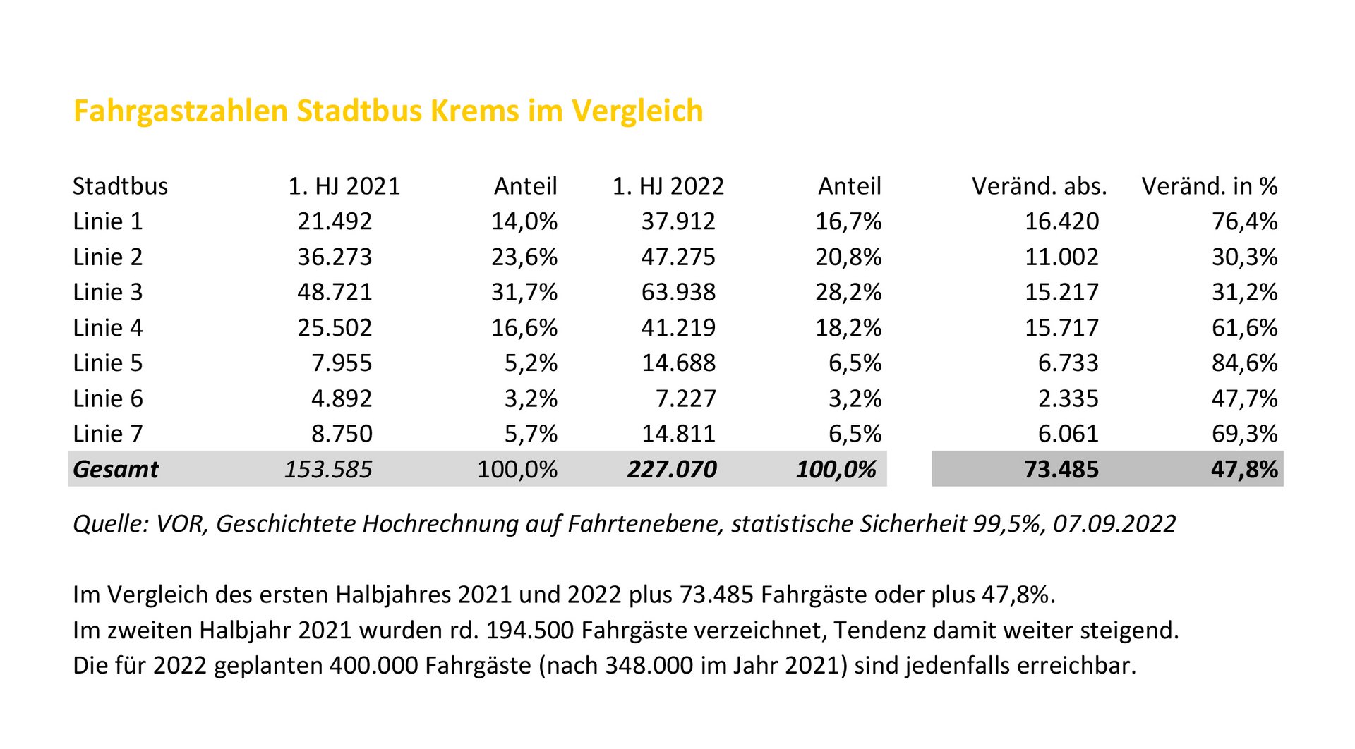 Die Detailanalyse der Ergebnisse zeigt deutliche Fahrgaststeigerungen auf allen sieben Linien. Die bereits im alten System im Halbstundentakt geführten Linien 2 und 3 konnten deutlich zulegen, jeweils um mehr als 30 Prozent. Die Akzeptanzsteigerung ist auf den Linien 1 und 4 primär auf den neu eingeführten Halbstundentakt von rund 76 Prozent bzw. 61 Prozent zurückzuführen, sowie durch bestmögliche Fahrplanabstimmung zu den Zugverbindungen nach Wien und St. Pölten und ausgedehnten Bedienzeiten an den Tagesrändern, speziell für Pendler.