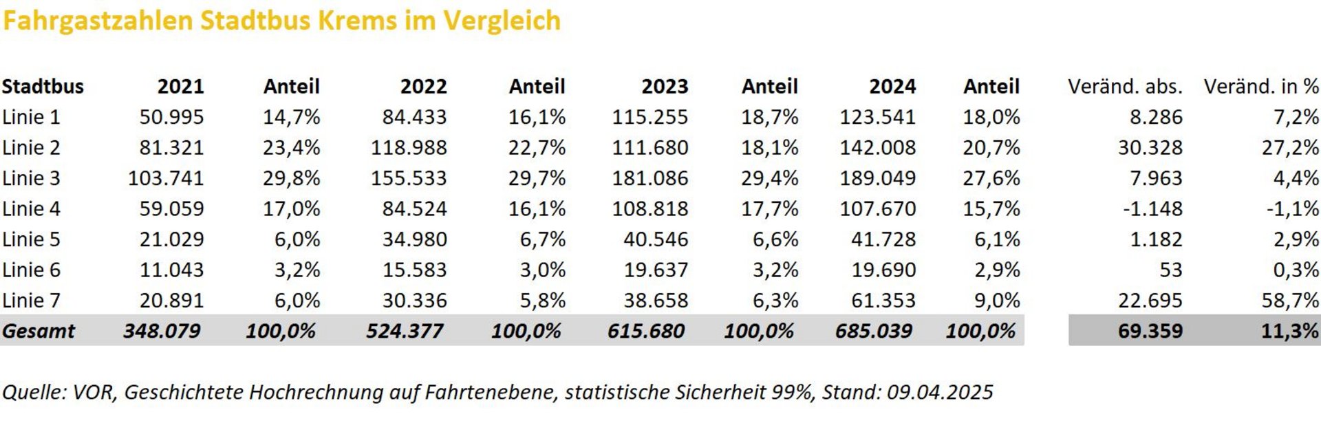 „Die beeindruckenden Fahrgastzahlen zeigen, dass unser öffentlicher Verkehr in Krems auf dem richtigen Weg ist. Der Stadtbus ist ein Erfolgsmodell – leistbar, verlässlich und bürgernah“, freut sich Bürgermeister Peter Molnar über die Entwicklung. Besonders erfreulich ist die starke Nachfrage bei der Linie 7, deren Einführung im Stundentakt sich als voller Erfolg erweist, mit einem Zuwachs von 58,7 Prozent. Auch das erweiterte Angebot am Samstagnachmittag wird sehr gut angenommen und rege genutzt. „Mobilität muss einfach und alltagstauglich sein, genau das bietet unser Stadtbus. Es ist erfreulich, dass unsere Maßnahmen so gut angenommen werden“, betont Mobilitätsstadträtin Alexandra Ambrosch.