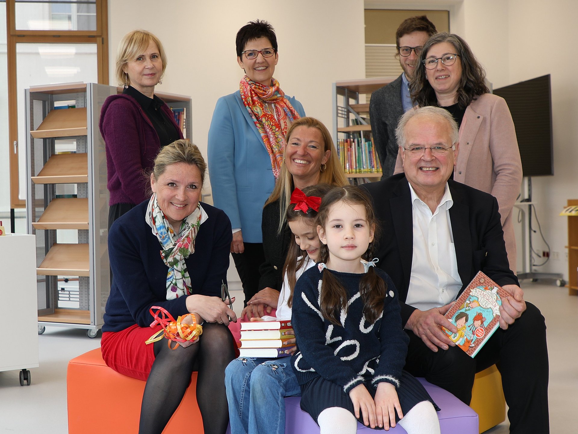 Foto1: Stadträtin Susanne Rosenkranz, Schulleiterin Daniela Ebner, Bürgermeister Reinhard Resch wünschen den Kindern Ajna Fejzulavic und Veronika Potapova viel Glück (vorne von links). Bereichsleiterin für Kultur und Bildung Doris Denk, Qualitätsmanagerin Susanna Ripper, Amtsleiter für Bildung Georg Braunschweig und Martina Riepl (Amt für Bildung) schlossen sich den Wünschen an (hinten von links).